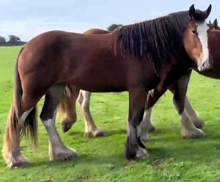 Deze prachtige merrie is een Shire x Clydesdale en is in het echt een zeer mooie merrie. Ze is niet erg groot, wat ideaal is voor iemand die de voordelen van deze rassen wil, maar niet de grote afmetingen. Ze heeft unieke markings, een mooie manen en staart, en een rijke voskleur. Ze is goed in de wei met andere paarden of kan ook prima alleen, en heeft een vriendelijke aard. Serieuze geïnteresseerde kopers zijn van harte welkom om ons te bezoeken in Shropshire, VK. Wij hebben een breed scala aan Shires en Clydesdales, van TOP kampioenen tot fijne familiepaarden – merries, hengsten, veulens, ruin en merrie. Shire- en Clydesdale-paarden uit het thuisland van kampioenen. sheila@shiresandclydesdales.com 0044 1606 883869 01606 883869