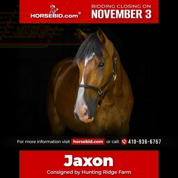 ⚜️𝐓𝐇𝐄 𝐅𝐀𝐋𝐋 𝐇𝐄𝐑𝐈𝐓𝐀𝐆𝐄 𝐂𝐋𝐀𝐒𝐒𝐈𝐂⚜️ Happening now thru MONDAY | NOVEMBER 3rd - Available EXCLUSIVELY on HorseBid's website! For more details and to register visit: www.Horsebid.com CONSIGNOR CONTACT: Hunting Ridge Farm 410-936-6767 LOCATION: Street, MD BREED: Clydesdale Quarter Horse Cross REGISTERED: No COLOR: Bay HEIGHT: 16.1 AGE: 4 GENDER: Gelding Are you ready for your next Fox Hunting Buddy or trail partner? Meet Jaxon a 4 year old gelding Clydedale Quarter horse cross. He stands 16.1 hands tall. He enjoys getting bathes and being brushed. He will stand like a gentleman on cross ties. He has NO bad habits in the barn. He will pick up all 4 feet,good with clippers. He gets right on the trailer. Hauls like a champ. Jaxon is currently living out with mares and geldings. His best friend is Betty (mimi cow) He gets along with everyone but is low man on the totem pole. In the pasture he is the first one to greet you. He loves people. Jaxon has been out Fox Hunting last year and also has Fox Hunted this year. He is good with the hounds and will stand patiently at the checks. He is easy to rate and will go slow or pick up the pace. He is not in a rush. He is awesome out on the trails. Super Brave, will go through water, and over logs. Just a chilled boy. He will go through any obstacles first. He is safe with dogs,bikes, traffic. He will go in a group or ride out alone. He walks trots canters in the ring. He will get both leads. He will jump over small fences. He is a nice mover with a floating trot. Jaxon is more of a push ride. This summer he did pony rides at a busy fair. He did about 100 rides with a smile on his face. He loves kids. Zero maintenance, can live in or out. 100% sound with NO vices. This summer he was in during the day. He enjoys his fan. Jaxon is ready for his next best friend. Whether it is a trusted trail partner or a fun Fox hunter, family horse,or a reliable husband horse. Please feel free to reach out for any further information. Located in Street MD. 410 937 6767. Shipping can be arranged anywhere. Check out his videos. He is NOT spooky. You'll see.