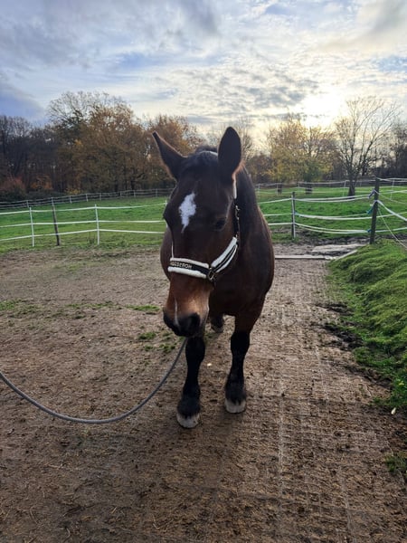 Verkaufe schicke Dunkelbraune Französin (Cob Normand) – Perfekt für die Freizeit! Zum Verkauf steht eine wunderschöne Cob-Stute, geboren im Jahr 2009. Mit ihrem beeindruckenden Stockmaß von 160 cm ist sie eine elegante Begleiterin für alle Freizeitaktivitäten. In der Halle geht sie super brav und ruhig, im Gelände kommt der Vollbluteinfluss etwas durch und sie ist spritziger (aber immer händelbar). Sie soll auch gefahren worden sein, aber das kann ich nicht mit Sicherheit sagen. Wir haben sie mal am langen Zügel laufen lassen und das hat sie gut gemacht. Sie überzeugt durch ihr freundliches Wesen und ihre Vielseitigkeit, ideal für ausgedehnte Ausritte und als Lehrpferd in der Halle, oder Platz. Die Stute ist gesund, gut ausgebildet und kennt den Umgang mit Menschen. Sie ist zuverlässig, ausgeglichen und eignet sich sowohl für erfahrene Reiter als auch für ambitionierte Einsteiger, die eine verlässliche Partnerin suchen. Sie steht derzeit im Offenstall und davor stand sie auch auf einer grossen Weide im Herdenverbund, daher weiß ich nicht ob sie sich für Boxenhaltung eignet. Außerdem mag sie es überhaupt nicht alleine gelassen zu werden. Bei Interesse oder für weitere Informationen stehe ich gerne zur Verfügung. Besichtigung und Probereiten nach Vereinbarung möglich.