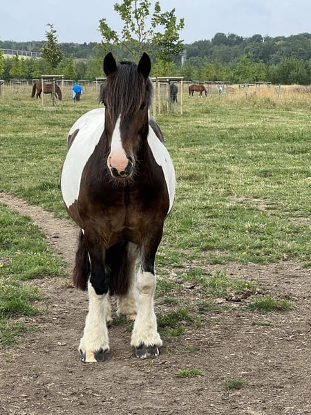 Silky Parcifal is a well-trained, athletic Irish Cob (Tinker) who masters all the elements of elementary dressage and is being introduced to medium-level dressage movements. He moves confidently in the field and is capable of handling small jumps outdoors. Trail riding, horsemanship, and calmness training are enjoyable diversions for him. He is not suitable as a show jumper. He comfortably integrates into both same- and mixed-gender herds, is socially well-adjusted, and easy to include. Currently, he has daily turnout with free access to hay, and at night he is stabled in a box with a weight-appropriate hay ration. Year-round pasture turnout is also possible. He is a hardy and healthy horse who enjoys being part of a herd. An equine health certificate with X-rays is available for review. Silky Parcifal is a friendly and approachable horse that seeks a rider who understands forward-downward riding, aids based on weight, and maintaining a calm hand. Trust and confidence are essential to him in human interactions, which is characteristic of a classic Irish Cob. He is not suitable as a children's horse and only conditionally suitable for young riders. Requests from clubs and riding schools are therefore not preferred. Silky Parcifal will only be sold into private hands, where his potential is nurtured, his herd life is ensured, and reliable care is guaranteed.