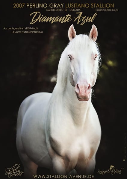 Ein absoluter Traumhengst in der Sonderfarbe „Perlino-Gray“. Eine absolute Seltenheit, denn Azul produziert ausschließlich Falben oder Falb-Schimmel. Hinreissend ist ebenfalls sein perfektes Exterieur und die ausdrucksstarken kräftigen Bewegungen aus hervorragenden Ahnen der VEIGA-Zucht! Sagenhaft und einzigartig ist zudem auch sein Charakter. Azul hat das Herz eines echten Portugiesen – sanft, anmutig, stark! In seiner Gegenwart fühlt man sich sicher, die Stärke, die in ihm steckt, lässt Geborgenheit zu. Sein tolles Wesen macht ihn zu einem äußerst verlässlichen Partner, der hingebungsvoll mitarbeitet und absolut bei der Sache ist. Azul braucht ein Gegenüber auf Augenhöhe, wie man es von einem Lusitano erwartet. Ein echter Worker, der sich jeder Herausforderung konzentriert stellt – im Gegenzug dasselbe von seinem Menschen erwartet! Azul hat ausgezeichnete Bewegungen und eine katzenhafte Leichtigkeit mit viel Go! Die Kraft, die man beim Reiten unter sich spürt ist phänomenal und lässt einen schwerelos erscheinen. Seinen edlen und erhabenen Ausdruck ohne aufgesetzt zu wirken und seine Intelligenz gibt er unweigerlich an seine Nachzucht weiter! Wir sind sehr stolz auf diesen Traumhengst und möchten ihn nicht mehr missen.