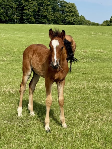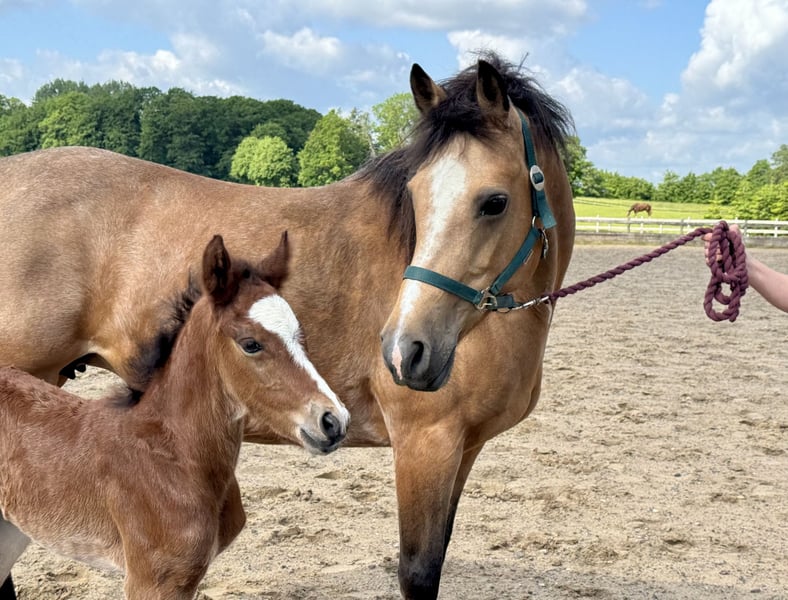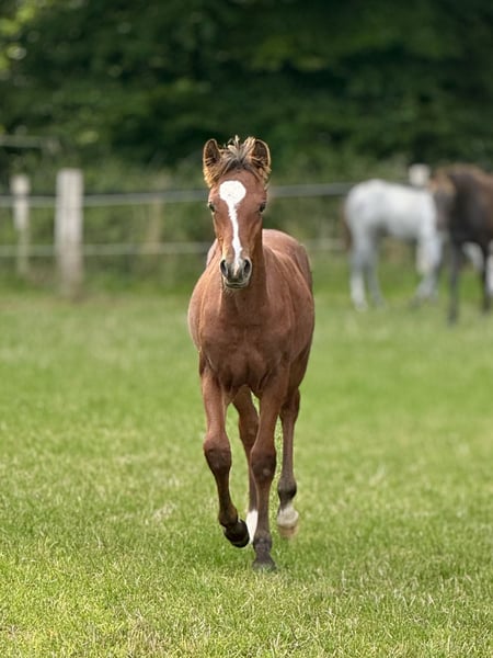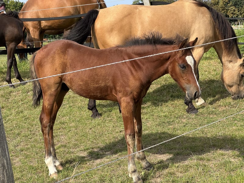 After being weaned in November, this expressive colt "Borghorsts Martini" is looking for a new owner. Martini is raised in a species-appropriate manner in a pasture with a herd of mares and foals. He is very herd-compatible and plays with the other foals. He is registered with the horse studbook in Schleswig-Holstein. His mother Silver Beauty is sired by Gvennic de Goariva x Silver Shadow, both ponies have been highly successful in international pony show jumping. His father Arda’s Murphy has produced licensed stallions throughout Europe, as well as award-winning mares and foals. Our foals are regularly dewormed, introduced to the farrier, and are halter-trained.