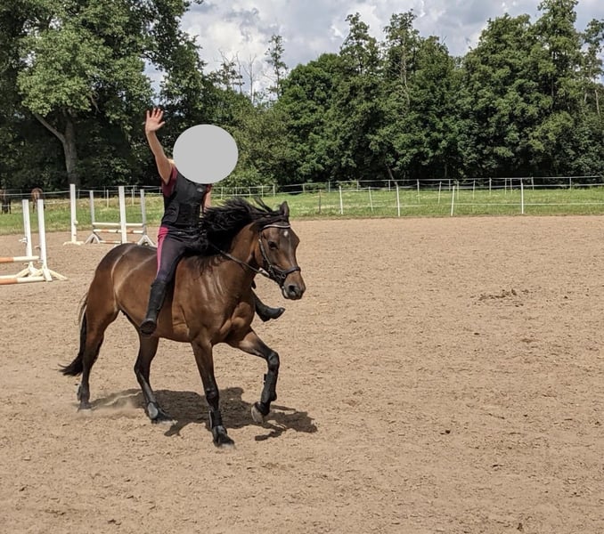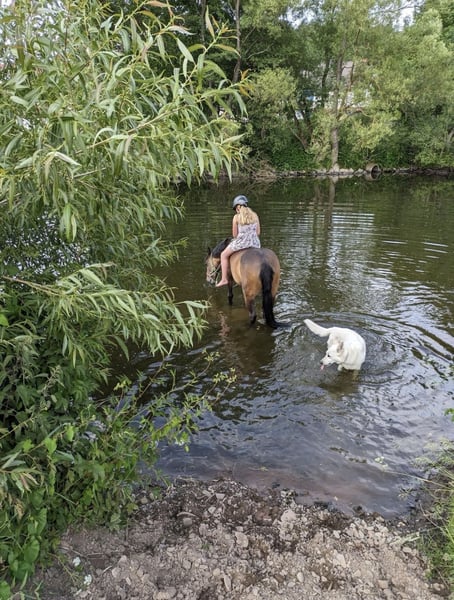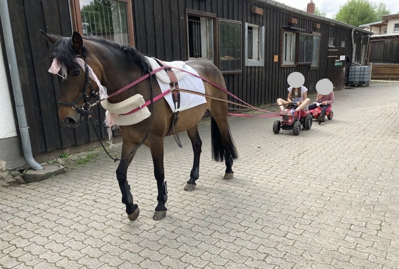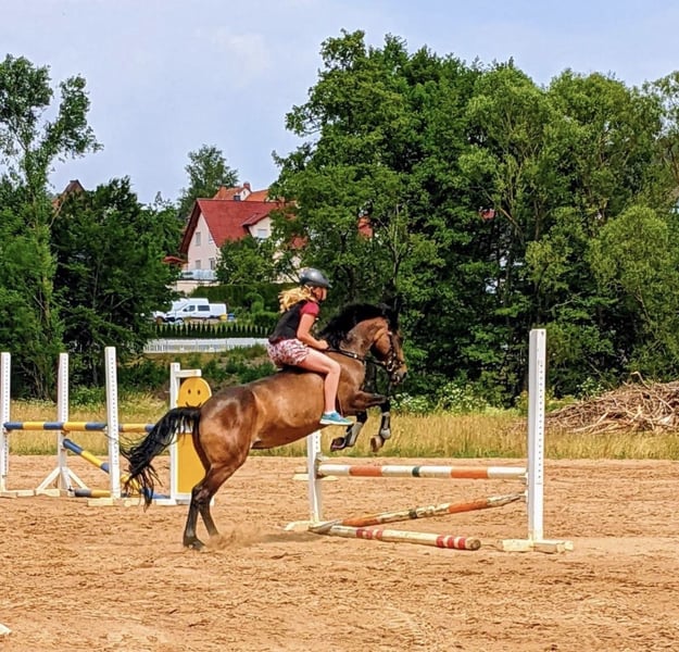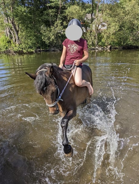 Zum Verkauf steht eine charmante Connemara-Stute geboren: 2013 Stockmaß: 147cm Sie ist ein echtes Herzenspony: kinderlieb, brav im Umgang und für nahezu jeden Spaß zu haben – dabei stets ehrlich und verlässlich. Sie ist eine gute Lehrmeisterin. Auf dem Platz oder in der Halle will sie geritten werden, ist aber immer absolut brav. Im Gelände ist sie eine Lebensversicherung, geht überall hin, egal ob allein oder in der Gruppe, sie kommt mit Kind immer wieder heil Zuhause an. Turniere kennt sie, dort ist sie allerdings meist etwas schüchtern. Das Pony ist WBO—Prüfungen (Dressur, Springen und Vielseitigkeit), E—Springen und E—Dressur gegangen. Sie wird nur wegen Umstieg auf Großpferde abgegeben. Wir suchen ein liebevolles Zuhause für sie, in dem sie geschätzt wird und weiter Freude bereiten darf. Platz vor Preis.