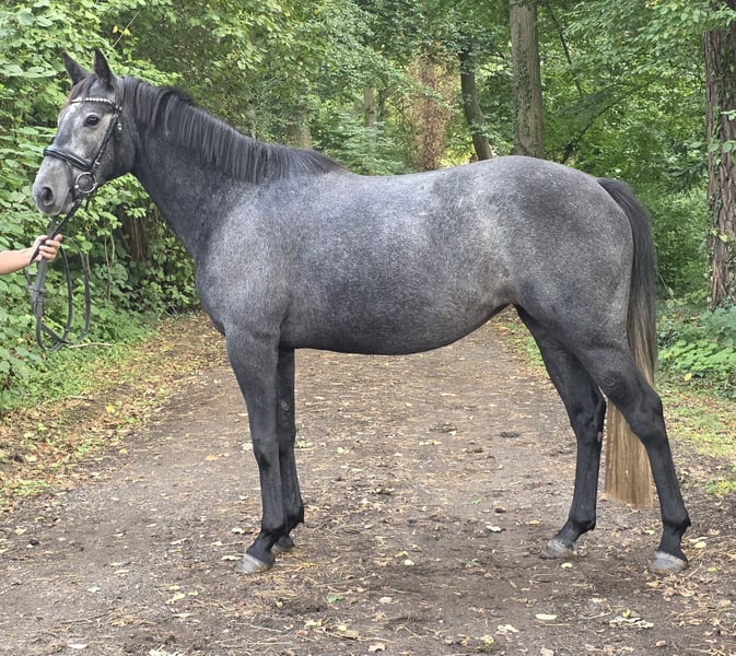 Melody is a approximately 153 cm tall Connemara pony mare with full papers. Yes, she will still grow. :-) Her father is sired by I Love You Melody. Melody has been gently backed here in Germany. She has been under saddle for about 6 months now. From day one, this pony has been nothing but sweet. Melody is an all-rounder. She has potential for dressage and jumping, as well as for eventing. But she is also familiar with regular trail riding, and you can simply relax with her. Great pony for connoisseurs of this breed or those who want to become one. We always say Connemara ponies can do it all. :-) A current vet check with no findings is available. For more information, we look forward to your calls at: 0177/2721831.