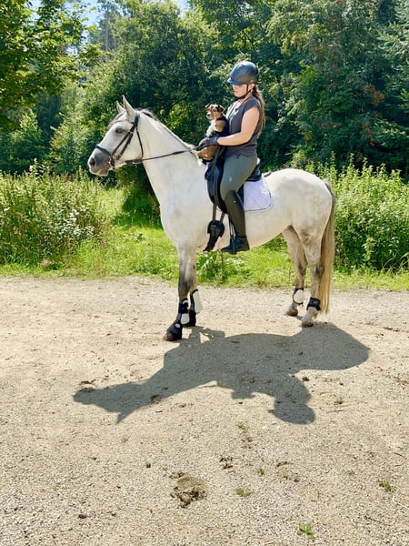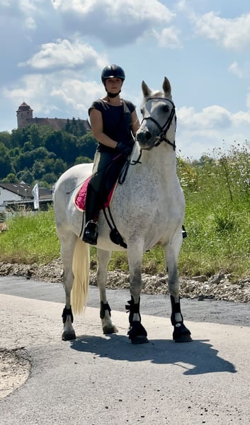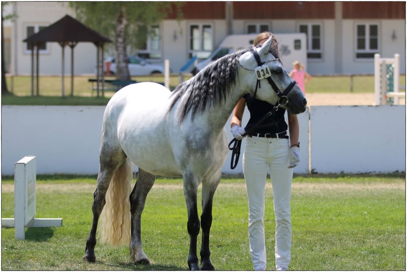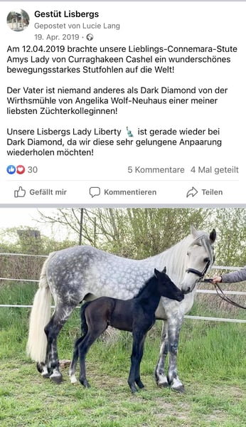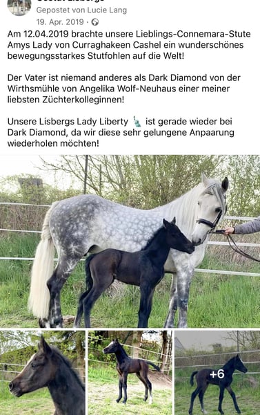 Lisbergs Lady Liberty Lisbergs Lady Liberty ist eine sehr schöne im Ponymass stehende Rappstute aktuell mit 1,43 m und wird die 1,48 m nicht überschreiten! Lisbergs Lady Liberty wurde am 12.06.2019 im schönen Lisberg morgens um 6.16 h geboren. Lisbergs Lady Liberty ihr HWSD-Status lautet N / N, dass heisst kein Träger und ideal zum Züchten auch mit seltenen Blutlinien der Rasse Connemara. Lisbergs Lady Liberty Mama ist Amy's Lady von Curraghakeen Cashel und mütterlicherseits von Westside Mirah und anderen Top-Vererbern der Connemara-Zucht. Die Mutter Amy's Lady ist auch eine leistungsgeprüfte Zuchtstute mit 7,68 zufällig das selbe Prüfungsergebnis wie Ihre Tochter Liberty. Liberty verfügt über ein gesundes Selbstbewusstsein welches ein gutes Sportpony für seine Zukunft braucht. Ihre 3 Grundgangarten sind ausdrucksstark mit guten Bewegungen schöner Balance, sie verfügt über eine gute Springmanier und hat auch auch schon ein paar kleine Sprünge mit dem Reiter absolviert. Liberty ist das ideale Pony für einen besseren Reiter, der viel mit seinen Pony lernen und erleben möchte. Sie wäre auch ein gutes Busch-Pony, da Liberty ein mutiges Pony ist. Lisbergs Lady Liberty Vater Wirthmühle Dark Diamont wurde Siegerhengst der Sportponies bei der Körung am 10.03.18 – mit einer sensationellen Note von 8,0 im Körprotokoll! Leistungsprüfung sein enormes Vermögen, mit einer sensationellen Note von 8,7 Punkten. Zudem hat Dark im Januar 2023 auf der FN Bundesschau in Berlin die begehrte Bundesprämie erhalten. Liberty geht ganz nach Ihrem sportlichen Vater und hat all das liebenswerte und auch die Schönheit von Ihrer Mama Amy's Lady genau wie die sportliche Leistungsbereitschaft! Liberty ist Barhuf und liebt es sich in der Natur zu bewegen! Beim Auf- und Absitzen ist sie super entspannt! Auf Grund ihres guten Charakters und der Freundlichkeit gegenüber anderen Pferden und Hunden wäre sie auch ein gutes sicheres Geländepferd für einen nicht so starken Reiter auch mit Hund oder für die Reitjagd! Wir legen im Moment eher den Schwerpunkt in die Geländesicherheit und auf das Reiten im Strassenverkehr! Selbstverständlich geht Liberty auch alleine ins Gelände, kann zu einer Gruppe hin und auch wieder weg geritten werden und kommt mit dem Reiter auf dem Rücken wieder nach Hause! Liberty ist mit 7,68 Punkten in Ansbach am 25.04.2023 Leistungsgeprüft worden. Lisbergs Lady Liberty wurde bei der Stutbucheintragung am 17.05.2023 in Burgebrach mit 7,57 Punkten nach München zur Landesschau eingeladen! Auf der Landesschau erhielt unsere Lisbergs Lady Liberty den Titel Prämienstuten-Anwärterin und sind sehr stolz auf diese schöne typvolle junge Stute, danach schickten wir unsere Lisbergs Lady Liberty in die Sommerferien und jetzt ist sie frisch erholt aus Oberbayern zurück und die Arbeit beginnt langsam wieder. Liberty hat kein Sommerekzem und andere Unarten wie Weben oder Koppen! Lady reist gerne mit Pferdetransporter oder im LKW! Sie ist ein ideales Pony für Leute die es ein Pony im Ponymass möchten. Liberty verfügt über schöne raumgreifende Grundgangarten, wobei der Galopp besonders hervor sticht und in der Offenstallgruppe und im Panel-Boxenstall und in der Box benimmt sie sich hervorragend.Liberty ist sie grundimunisiert mit EHV 1,4 sowie Tetanus und Pferde-Influenza und regelmässig entwurmt! Leider passt unsere Lady nicht mehr in unser neues Zuchtkonzept, da sie mit unseren „neuen“ Connemara Hengst für unseren Geschmack zu ähnlich ist, daher jetzt der schwere Verkauf dieser weissen bayrischen irischen Elfe. Das komplette Pedigree von Lisbergs Lady Liberty finden Sie in der Abteilung Dokumente, da ehorses häufig die Abstammungen nicht komplett wiedergibt genauso wie Ihre Leistungsprüfung vom 25.04.2023. Nicht vergessen, darf man das Connemara Ponies erst mit 7-8 Jahren komplett ausgewachsen und entwickelt sind, daher ist eine altersgerechte Reiterei ein Garant für lange Freude am Pony! Gut gepflegte Connemaras sind langlebig und 30 Jahre ist keine Seltenheit bei der Rasse. Sollten Ihnen Lisbergs Lady Liberty gefallen, wenden Sie sich bitte direkt an die angegebenen Nummern aus der Anzeige und geben Sie bei einer email Ihren Namen und Ihre Mobilrufnummer an- gerne können Sie uns auch direkt über WhatsApp unter 00491713415878 kontaktieren, in unserem schönen Ort funktioniert das mobile telefonieren leider nicht oder nur sehr schlecht! Pro Besuch auf unseren Betrieb erheben wir eine Kennenlern-Pauschale von 50€ wochentags und 70€ an Sonn- und Feiertagen! Liebe Grüsse und vielleicht bis bald - Gestüt Lisbergs ist immer eine Reise wert!