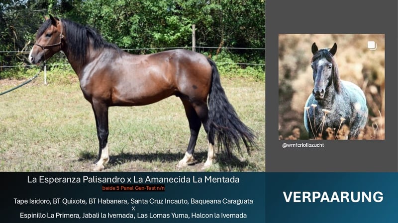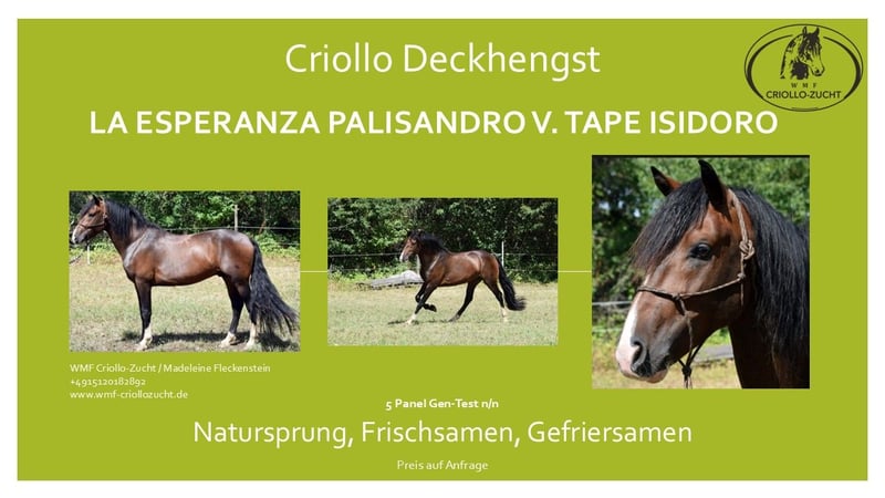 BREEDING ANNOUNCEMENT!!! Palisandro is a double of his WORLD-FAMOUS father Tape Isidoro! He is one of the few purebred Criollos who is a direct descendant of the famous Tape Isidoro. 5 Panel Genetic Test n/n Information about Tape Isidoro: Tape Isidoro was born in Uruguay in 1995. Arriving in Germany at just 5 years old, he soon became World Champion, Vice World Champion, and fourth in Cattle Penning. Then came the licensing in Munich. The surprise was great when he became the licensing champion. He was the first Criollo at the Americana and placed 6th in the Working Cowhorse at the European Championship. With over 100 wins and placements in Reining, Trail, Horsemanship, Pleasure, Working Cowhorse, and Working Equitation Master Class. He has successfully participated in many trade fair appearances with joy. You are a legend in Criollo breeding. He passed away in 2024 at the age of 29. Our PALISANDRO is not only a spitting image of him visually, but also character-wise, he is the exact replica of his father and probably one of the few direct descendants in Germany of Tape Isidoro, who serves as a breeding stallion. More information and videos can be found at the following link: https://www.facebook.com/p/Criollo-Hengst-Tape-Isidoro-100063710221535/ The last pictures show Tape Isidoro! www.wmf-criollozucht.de Price on request