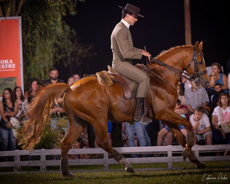 Sehr lieber und freundlicher Hengst. Ausgebildet im hohen Niveau in Working Equitation und Dressur. Einfache Fliegenschritte und Tempiwechsel 4, 3, 2 sowie Pirouetten. Hat Show-Erfahrung. Standort in Zentralportugal.