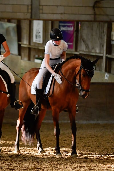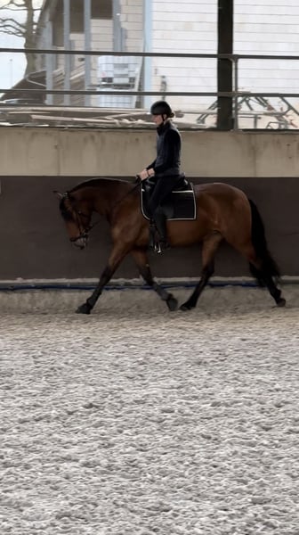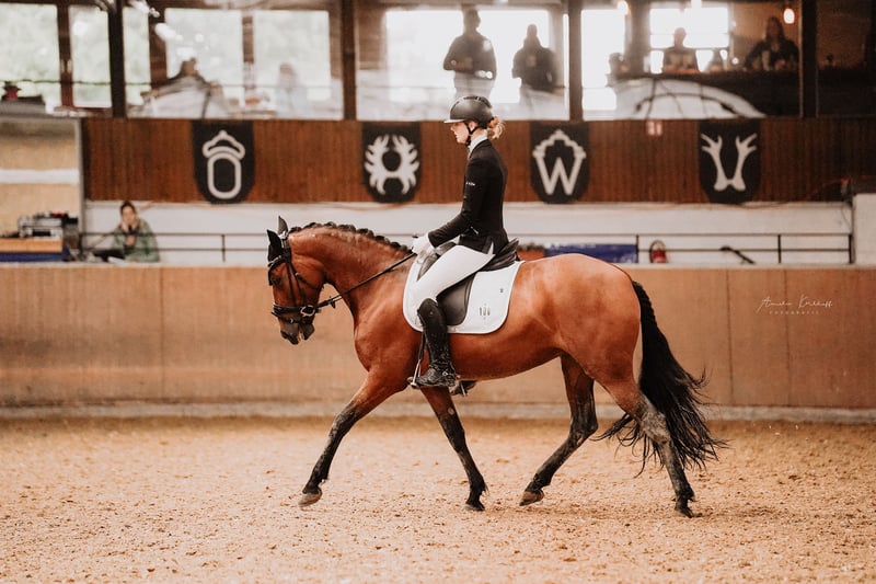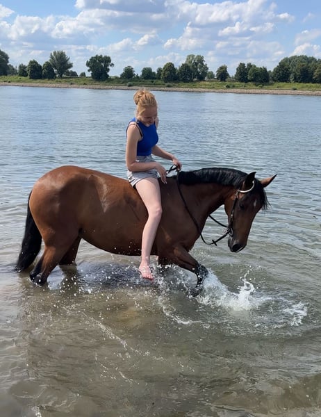 With a heavy heart, I am looking for a new home for my mare due to lack of time. I bought her as a three-year-old, just backed, and trained her together with my trainer up to Elementary dressage. It was very important to me that she always has enough time, which is why we only competed in class E this year — successfully. She is an absolutely level-headed, honest, and incredibly people-oriented horse. She remains calm in new situations, pays attention, and trusts her handler. Despite her gentle nature, she sometimes needs a clear, loving hand to guide her. She is always motivated in work, learns quickly, and enjoys hacking out. Even children or less experienced riders can handle her wonderfully. She loads onto the trailer without issue and remains calm in new environments, whether at competitions or in unfamiliar terrain. I wish for my Candy to find a home where she is considered a family member, just as she is with me. I can very well imagine her as a children's pony or as part of a mother-daughter pair. I am not looking for a sports stable or a dealer but for her person — someone who sees her with their heart. A home where she is seen, understood, and simply allowed to be a horse — whether as a leisure partner, family horse, or beloved companion. If genuinely interested, I am happy to share more about her background and send current videos. I hope to find someone who sees her with their heart — she truly deserves it. A veterinary health check (AKU) is of course possible. For an additional fee, her saddle and equipment can also be purchased. A trial ride costs €35, which will be deducted from the purchase price. Price is secondary to finding the right home.