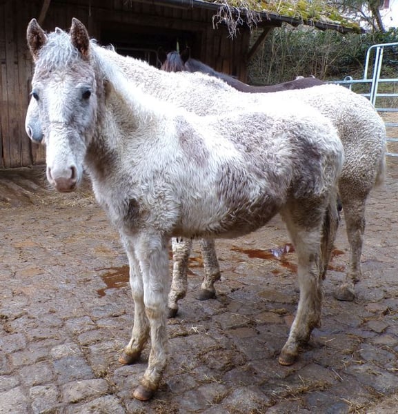 Leonardo is a nice, still somewhat shy young stallion with Pinto papers from the ZfdP, as Paso Fino is not allowed with the Curlys. His father is a Paso Fino, from whom he also inherited the tölt, and his mother is a pure Curly Horse. ICHO papers can be applied for. He will be gray; as a foal, he was a chestnut pinto.