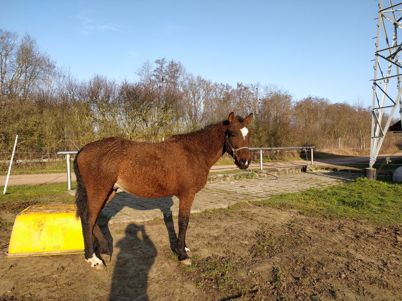 Allow me to introduce Lucky. An adorable 4-year-old curly gelding. Extremely curly, very affectionate, and incredibly gentle. Ridden by children, he would make an excellent family horse. He is versatile (show jumping, dressage, cross-country, hacking) and has already completed a small jumping course. He rides alone and in company on hacks. He lives both in the field and in a stable, born and raised in a herd. He is currently barefoot and has very good hooves.