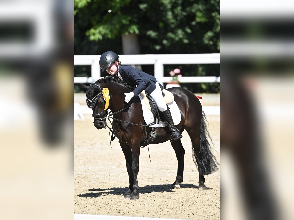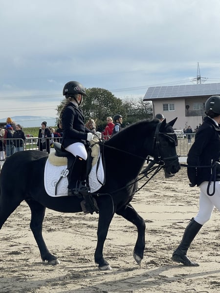 Sie ist ein tolles von Kindern gerittenes Pony mit eigenem Kopf. Mit unseren Töchtern ist sie von Führzügel bis Dressurreiter WB gestartet und war hier immer anständig und platziert. Im Umgang ist sie lieb und lässt sich auch von Kinder führen/ aus der Box holen. Aufgrund einer Schimmelpilz-Allergie benötigt sie bedampftes Heu und sollte in einer Paddockbox oder im Offenstall stehen. Aktuell steht sie in einer Paddockbox, hier haben wir ihre Allergie gut im Griff und sie benötigt keinerlei Medikamente.