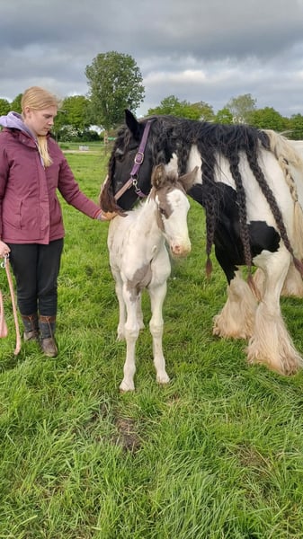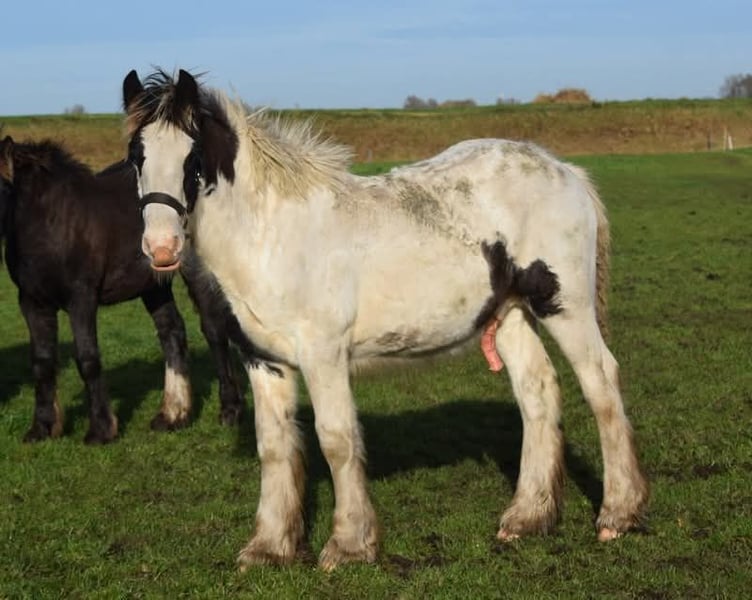 White Knight is a stunning colt. He is expected to grow to a height of approximately 1.60/1.65 meters. Mother is a Tinker mare. Father is a Clydesdale stallion, Stobilee Proclamer. He received his first premium and was awarded day champion at the NSvT inspection.