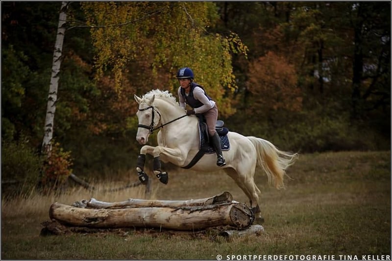 Warmblood stallion in Cremello (double dilute) | born 2010 | 169 cm AES, ZSAA (German Edelblut), Royal Belgian Palomino, licensed Approved for KWPN-A, Zangersheide, IFCE, ISR/Oldenburg N.A. 70-day stallion performance test Neustadt/Dosse + HLP-Sport Marbach Genetics: e/e A/a Cr/Cr ECVM: no findings (2022, international research programme) WFFS, CA, SCID: free Alasdair GF enjoyed many years of sporting success and was placed in cross-country competitions up to class L. In 2015, he was the youngest horse to take 9th place in the ZfDP TOP TEN eventing horses. He has produced colourful, athletically talented offspring worldwide – both in warmblood breeding and in partbred projects. Bred by Gestüt Falkenhorst (Gwendolyn Gregorio), Alasdair comes from a traditional colour and refiner line. His sire, RFF The Alchemist xx, was imported from the USA (Red Fox Farm) and was one of the first double lightened thoroughbreds with Trakehner approval in Germany. Alasdair is performance-tested, strong in character and clear in type. He consistently produces modern, strong-moving foals with substance, conformation and colour – 100% lightening with the appropriate gene combination. As a cremello, he always passes on a cream gene. Due to his genetic background, he is suitable for both classic warmblood mares and projects with breeding goals.