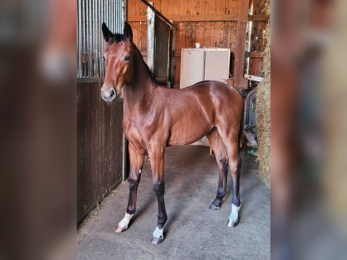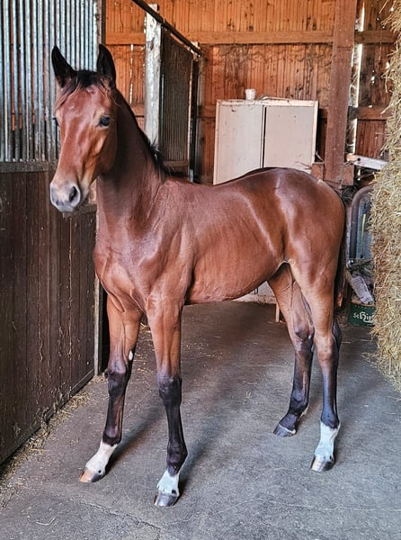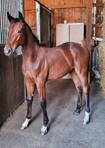A highly promising stallion foal with elastic, expressive gaits is being offered for sale. This exceptional young German sport horse stallion, born in 2024, captivates with its elegant appearance and outstanding potential in dressage. The bay colt already demonstrates impressive movement and natural grace, making him a future star in the dressage arena. Motherline information: Reserve champion at the Lienen Foal Championship, winner at Gestüt Schloßäcker, winner at the State Show, 2-year-old winner. Full brother and several other sport horses also belong to this dam line.