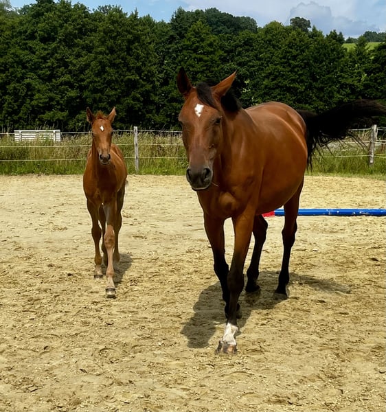 Wir verkaufen unsere Hauptprämienstute Ce la vie *2013. Sie stammt von Carrico ( Catoki) x Arpeggio / Francisco 1 ab und wurde ihre ersten 6 Jahre Drrssurmäßig bis zur Klasse M ausgebildet, da sie eine sehr gute Bewegungsdynamik und Rittigkeit zeigt. Auf Grund eines Pferdewechsels und ihrer guten Abstammung sowie ihrer Hauptprämie ist sie dann in die Zucht gewechselt und hat uns 5 sehr schöne Fohlen geschenkt. Zwischenzeitlich wurde sie wieder ein Jahr von geritten und zeigte sich auch im Springen sehr talentiert. Aktuell ist sie von Global Dancer tragend und für den 12.5.26 ausgerechnet. Ce la vie ist ranghoch und ein absolut verlässlicher und ehrlicher Charakter. Sie wurde regelmäßig entwurmt und dem Hufschmied vorgestellt und ist Verladefromm. Mit Ce la vie stehen alle Wege offen, sie ist eine sehr liebe Mama, kann aber auch sicherlich wieder angeschoben und als Reitpferd genutzt werden. Die Fohlen aus 24 und 25 sind noch in unserem Besitz und können vor Ort besichtigt werden. Das Hengstfohlen aus diesem Jahr wurde für das Fohlenchampionat in Lienen zugelassen und hat den 12. Platz unter den Springbetonten Fohlen belegt. Pocket Rocket MB ist ebenfalls käuflich zu erwerben. Bei Interesse können sie mich gerne kontaktieren.