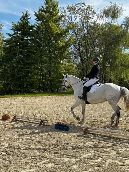 Due to lack of time, this dream mare is being offered for sale. Lou is an extremely balanced horse. A reliable horse that can stand still and remains calm, yet is never sluggish or lazy. She has very well-balanced, comfortable gaits. Her passion is jumping; she targets the jump, and the rest is done by Lou herself, forgiving rider mistakes (a self-starter). She is cautious but also has enough courage (jumps over everything without hesitation, perfect for eventing!) and has the right attitude towards jumping. A horse that always wants to do everything right and thinks along. Therefore, she brings everything one desires for higher-level sports. Lou has no vices and can be ridden by teenagers and children. At the ideal age of 13 years and her level of training, she is perfect for a good-riding amateur and for beginner jumpers. In the past, she has also competed in tournaments and can certainly start the season directly with the new owner. She is absolutely unspoiled and is now just being developed. In jumping, she is currently trained safely up to the L class, with individual M jumps tested, and she shows a lot of potential for further advancement – with increasing strength, moving up to higher classes will be effortless in the coming weeks. She also shows talent in dressage and is currently being professionally trained at L level. Both disciplines are supported by experienced trainers, which optimally aids her development. She is also completely safe on trails and goes out alone as well as in groups. Even on a halter or as a lead horse, she has previously participated in hunts, during carnivals, etc. She has never been sick with me. X-rays of her neck and back were taken without findings. A new vet check can be done at the buyer's expense. She has very good hooves (barefoot, but had shoes in the past) and stands well on her legs. She is regularly vaccinated, dewormed, and has just been to the farrier. Her teeth were done by the dentist in January, and she has been checked by an osteopath for sale. She is familiar with open stable housing but prefers a box with plenty of turnout, as she is very low in rank. Due to her height of approximately 1.74m, she is also ideal for men. Anyone interested in getting to know this talented dream mare or has further questions is welcome to contact me. I am happy to send additional videos of her along with a description of her new home. Viewings are possible by arrangement, with a fee of €30 for trial rides as compensation for the riding tourism. This is not a forced sale and will only be given to a suitable, appreciative home. Private sale!