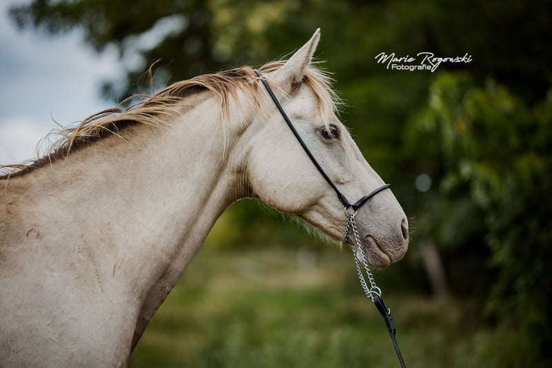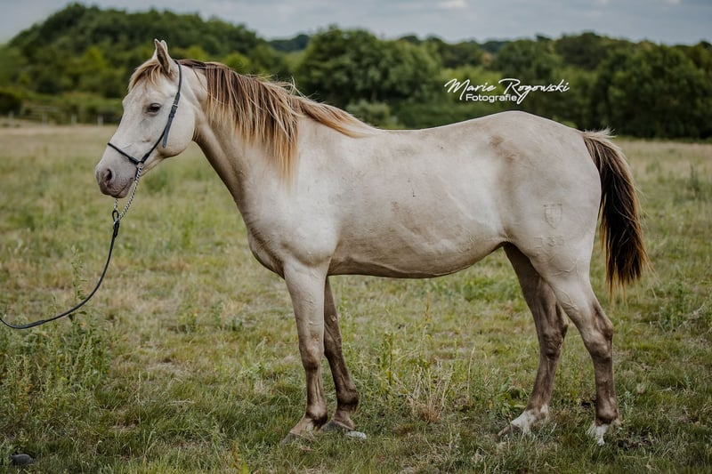 Warmbloedmerrie | Classic Champagne | geb. 2014 | 1,50 m Stamboek I Genetica: Zwart met heterozygoot Champagne, E/x a/a Ch/n KHREME KHASSIS GF is een rustige, sociaal geïntegreerde merrie met overzicht en innerlijke kalmte. Ze is mensvriendelijk, leergierig en heeft zich tot nu toe veilig bewogen in stabiele kuddestructuren. Ze is niet bereden en is niet gewend aan regelmatig omgaan – maar biedt door haar duidelijke karakter en haar afstamming potentieel zowel voor de fokkerij als voor een latere opleiding in de vrijetijdssport bij geduldige, ervaren mensen. Vader: RAPPTÄNZER – Oldenburgse dressuur bloedlijn met Rubinstein I – Rosenkavalier – Inschallah AA. Succesvol tot Grand Prix, met bewezen nageslacht. Moeder: KHREMISSIMA GF – eerste champagnekleurige merrie in het Warmbloed Stamboek I, uit de Palomino Zweibrücker hoofdstamboekmerrie MAIGOLD. Moeder vader: KHALVIN KHLEIN KpM (VS) – grondlegger van de moderne Champagne-Partbred-lijn in Europa.