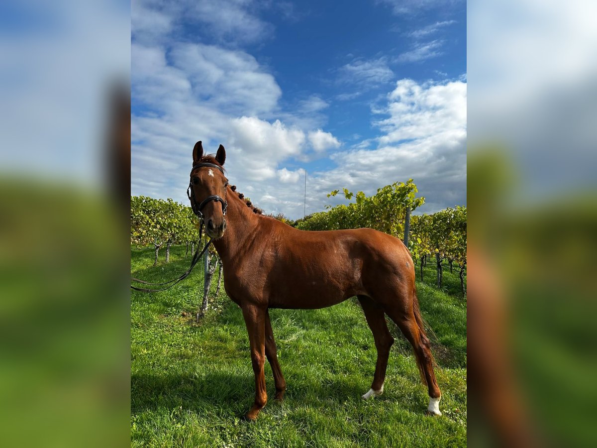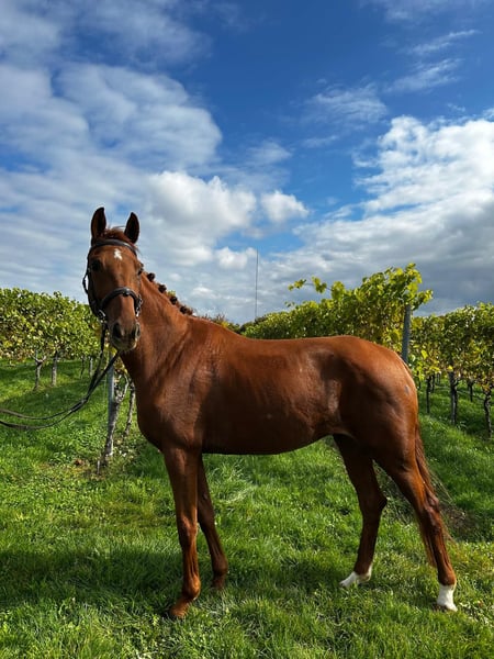 For sale is a 5-year-old chestnut mare with an excellent temperament and superb movement. She is well-behaved both in daily handling and under saddle, showing herself to be rideable, confident, and beginner-friendly. Whether in new environments or out in the field, she remains calm and uncomplicated. She has been ridden since the beginning of the year and also shows talent over fences. She previously produced a very typy foal by Finch Hatton, which displays a modern appearance and strong movement. This makes her suitable both for further competitive training and as a future broodmare.