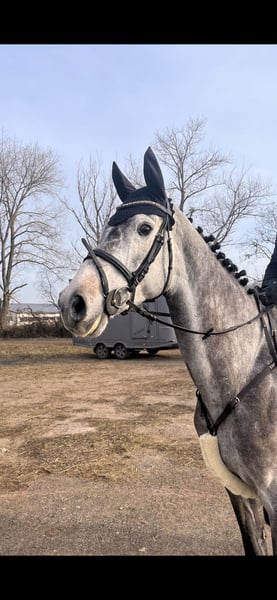7 jährige Schimmelstute von Denver x Carano x Quidam de Revel ,hübsch, brav, unkompliziert, 170cm groß, schmiede-und verladefromm, geht allein ins Gelände, erst 6 jährig angeritten, jetzt erstes Turnier vorgestellt, A** Springen fehlerfrei, aktuelle Röntgenbilder vorhanden, VB 17 000