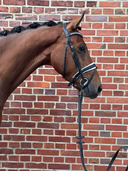 Zum Verkauf steht ein schicker, brauner Westfalenwallach mit hochwertiger Dressurabstammung und viel Entwicklungspotenzial.