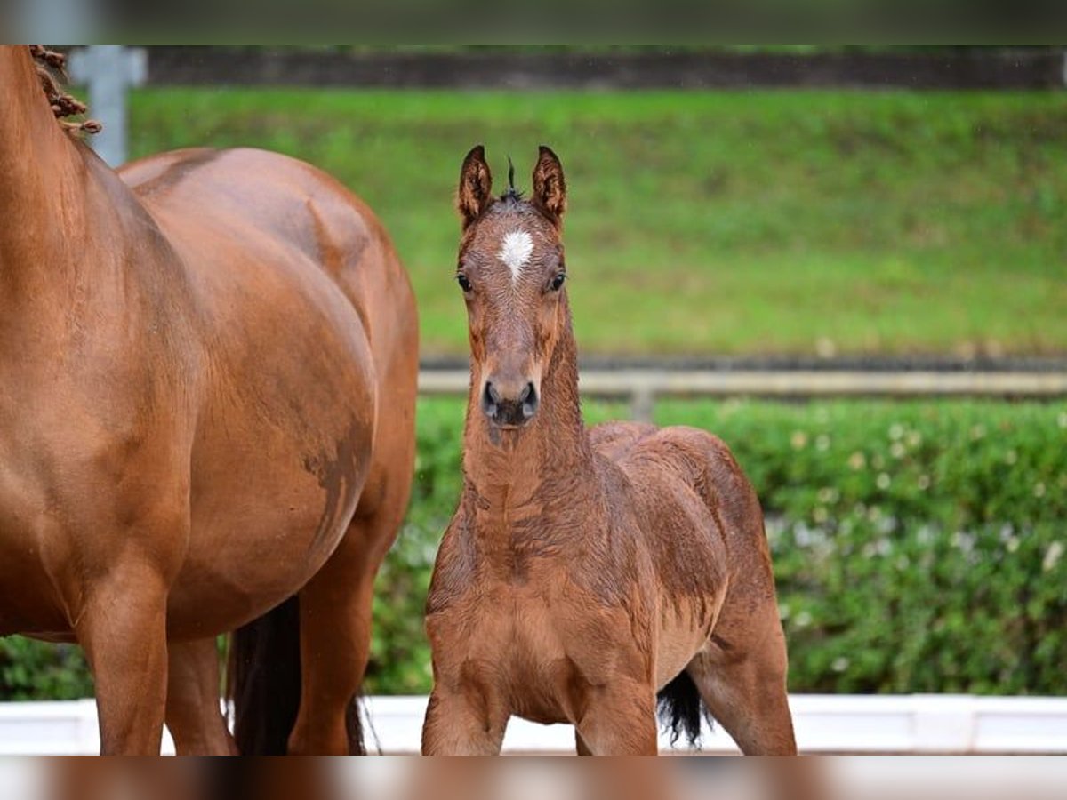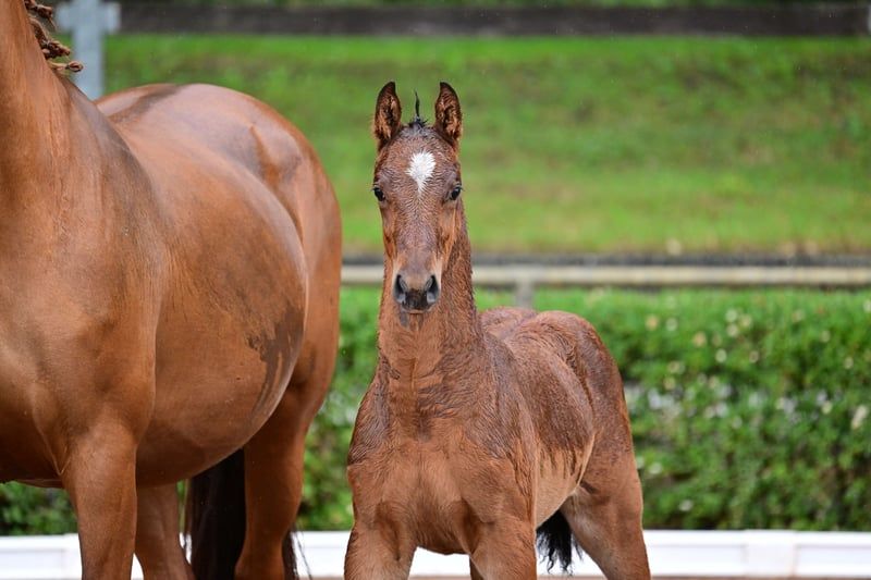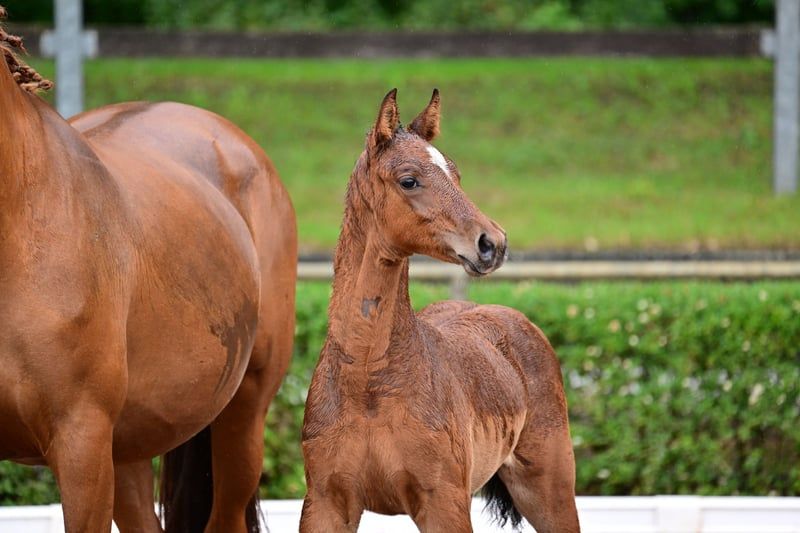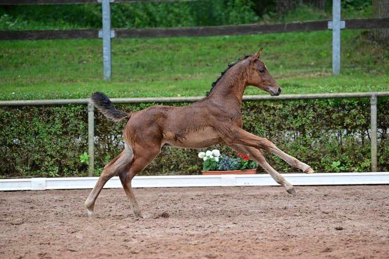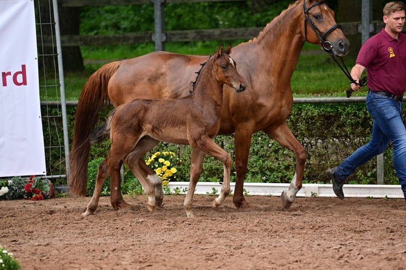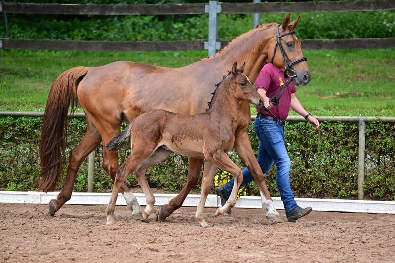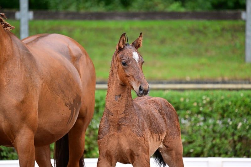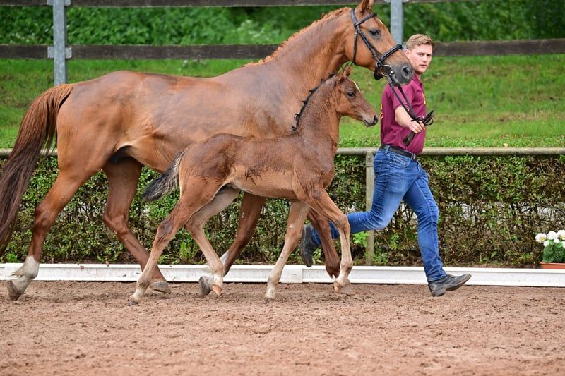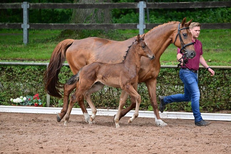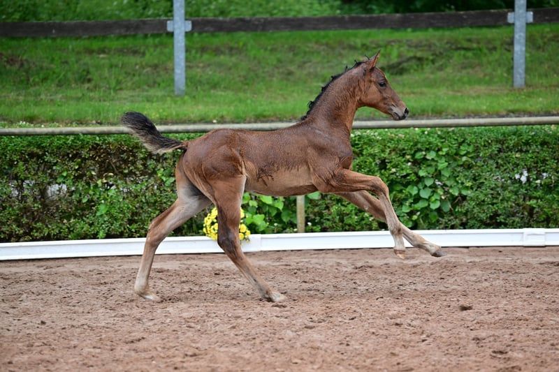 Charly - this beautiful, athletic German sport horse stallion, born in April 2024, impresses with his elegant appearance in the color brown and is expected to reach a final height of approximately 168 cm. A real eye-catcher due to his typical exterior and correct conformation. Charly is growing up in a herd environment, is dewormed, and is already familiar with the farrier and veterinarian. He shows a lively, people-oriented character and is curious as well as always trusting. He already knows the basics of foal training and walks calmly on a halter beside his mother. Charly's father is Cape Calidus (winner of the stallion performance test in Adelheidsdorf 2022). His mother is a daughter of Chap I. (father of the European champion DSP Chakaria). A full brother of this foal's mother was successful in S-level competitions in Balve and Hamburg at the small derby. Thanks to his promising jumping lineage, with a father who has been successfully presented, Charly is a great prospect for the jumping classes and a promising partner for the sport.
