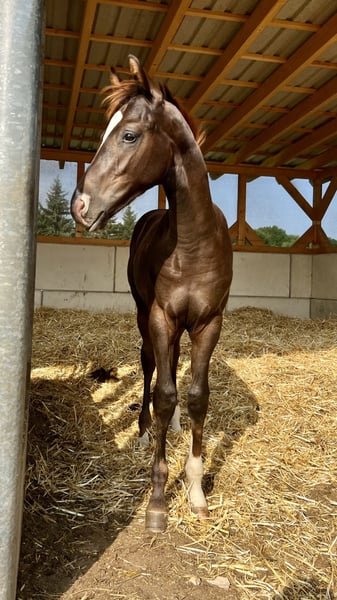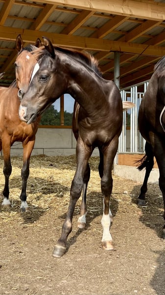 Real dark chestnut! Colt by Livaldon out of our De Chocolate – a horse close to our hearts with a bright future. This young dark chestnut has everything we desire from a modern sport horse: a beautiful silhouette, clear lines, very good basic gaits – and that certain something in expression. His sire Livaldon was a premium stallion of the State Stud Celle, successful up to S-class and known for his typy offspring with rideability and charisma. We are especially pleased that our foal belongs to the last crops of this exceptional stallion. The dam, our proven De Chocolate, always provides a solid foundation, good health, and fine movements. Her previous foals have found loving homes and are developing excellently there – something that is particularly important to us. Our little colt is friendly, curious, and very pleasant to handle on a daily basis. He is growing up in a herd in a species-appropriate manner and is given time to develop in peace. We wish for him a home where he will be supported – with patience, a loving eye for his qualities, and the willingness to see him as a partner, not just as a project. Further information, pictures, and a first video can be found here on our website.
