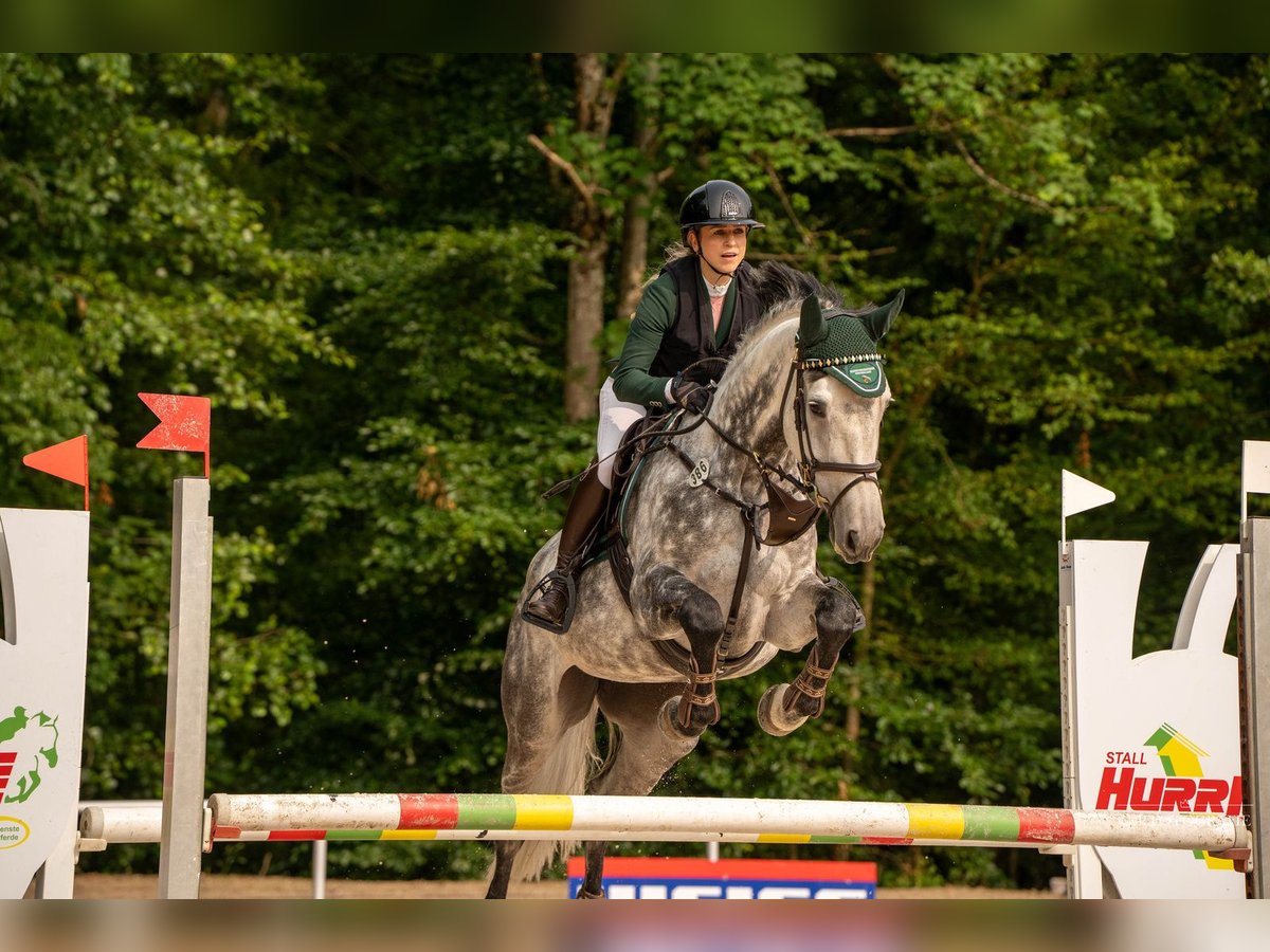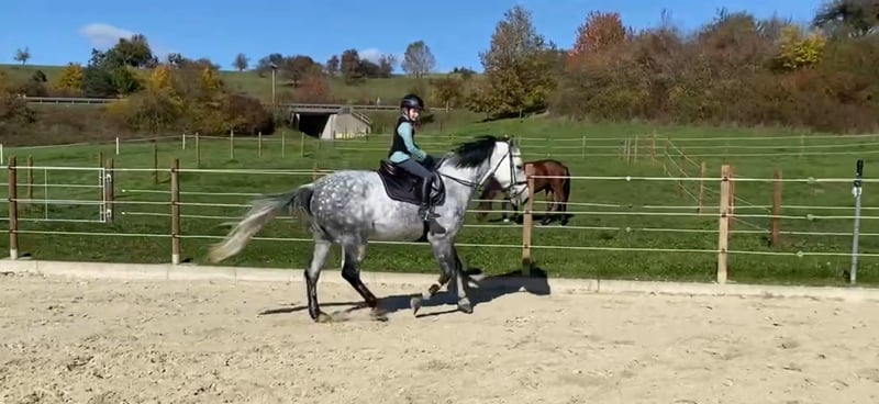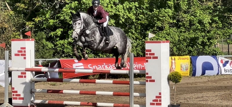 This elegant grey mare, sired by Kalaska de Semilly, is waiting for the right rider. She has been consistently ridden by various handlers and is always very willing to work. In dressage, she sometimes lacks patience, but as soon as there's a jump in the arena, she is fully motivated. Over the past few years, I have only competed her in A-level show jumping because I am quite nervous when jumping. She easily picks up on my nerves, which is why I have decided to put her up for sale. I could also imagine trading her for a kind, reliable gelding that competes confidently in L-level show jumping. She is excellent during loading, transport, and at competitions, and can be handled alone without any issues. She loves hacking out and is very suitable for children, as she responds very delicately to aids. In liberty work, she reacts to the smallest finger and voice aids.