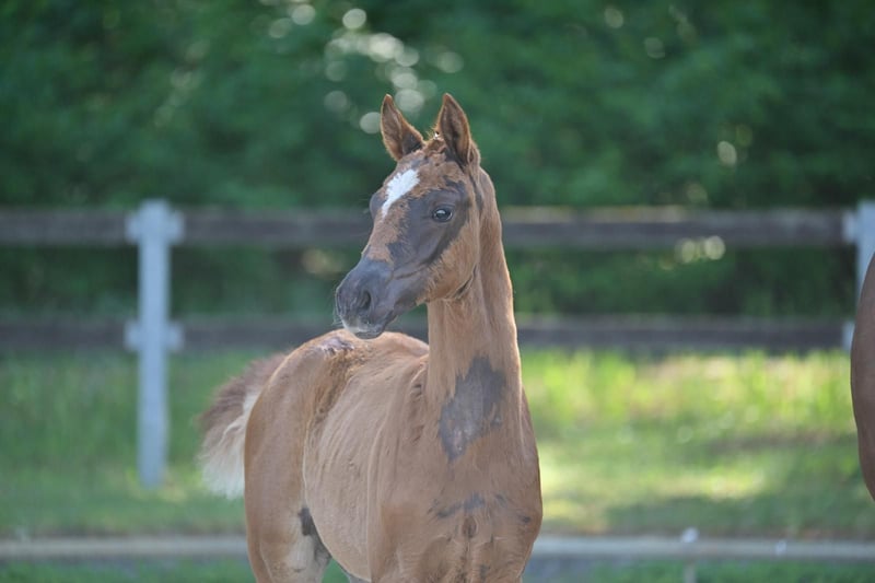 Schon jetzt überzeugt dieses langbeinige Stutfohlen durch einen ausdrucksstarken Bewegungsablauf mit viel Schub aus der Hinterhand, taktsicheren Grundgangarten und einem modernen Exterieur. Sie zeigt sich im Umgang menschenbezogen, aufgeweckt und mit einem klaren Kopf - ideale vorraussetzungen für Sort und Zucht.