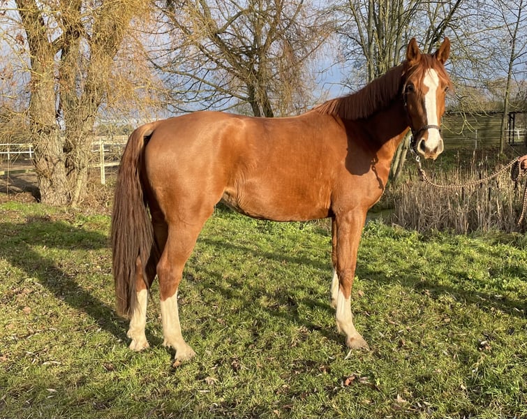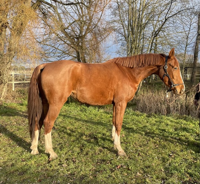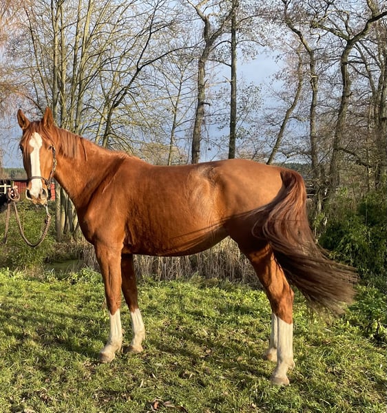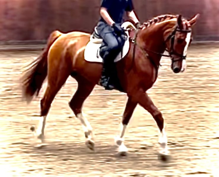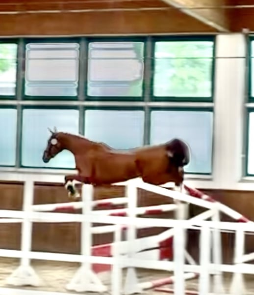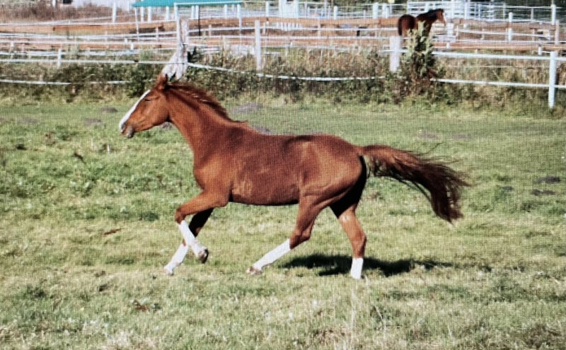Se ofrece una yegua roana de aspecto deportivo, llamativa, con un marcado patrón de color y excelente predisposición para el salto. La yegua de tres años desciende de Oganero P y, por parte de madre, proviene de una línea probada de Prinz Romadour – Prinz Oldenburg. La potranca está inscrita en el libro genealógico del PZVBA. Completó su prueba de rendimiento para yeguas con una sobresaliente puntuación global de 8,01 (puesto 6 de 23). En el trato diario, la yegua muestra una actitud cercana a las personas, es fuerte de nervios y muy dispuesta a trabajar. Incluso en campo, a pesar de su juventud y poca experiencia, se muestra tranquila y segura. Un talento en ciernes para deporte, ocio y/o reproducción. Por una pequeña imperfección, se ofrece a un precio muy reducido y solo en Teléfono: 0179 / 754 2321