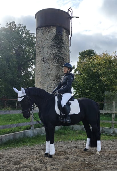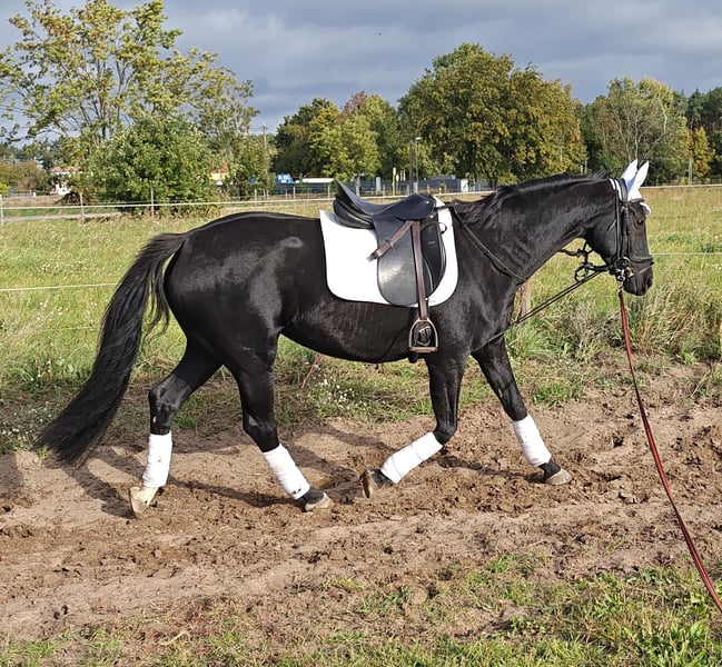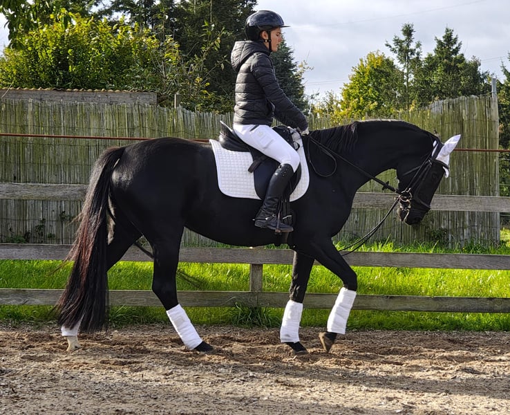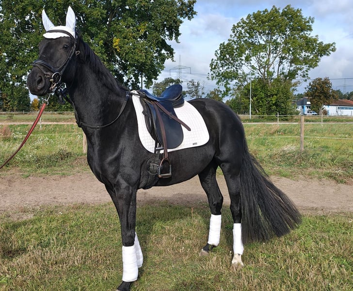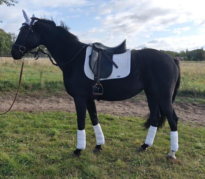 Mare DSP Dressage Horse (Confess Color x Hohenstein - Depardieu) - Black mare Limitations: Shivering, shows discomfort when having hooves picked out and backing up, not during daily work under saddle - 4 years old, born 04/21 - Directly from the breeder - Raised in a species-appropriate and loving environment - Shoeing friendly - Easy to handle, calm type with good basic gaits - Regularly vaccinated - Regularly dewormed - Ridden in all three basic gaits under saddle - No exchanges, loans, installment payments, etc. - Currently 1.63m tall - Zip code 14550 A forever home is sought, preferably with plenty of turnout and a small herd, just as she was raised. Serious inquiries are welcome. There is a fee of 30 euros for trial riding, which will be deducted from the purchase price. Price expectation negotiable at 4800 euros.
