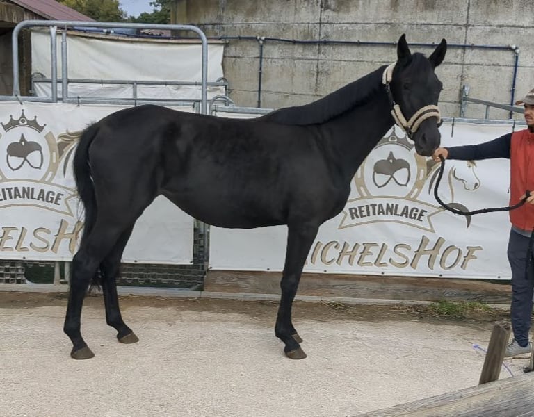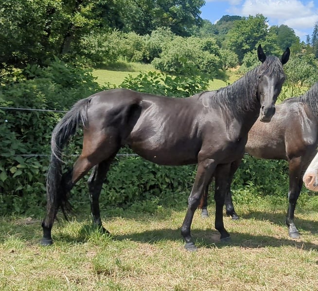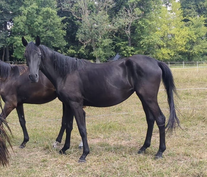 We are offering a stylish, jet-black mare from our own breeding. She is a refined, well-built horse with a correct conformation. In handling, she is a real sweetheart: halter-trained, easy to touch all over, willing to give her hooves, calm with the farrier, and has never been ill. She has three very good gaits, making her suitable for a successful career in the dressage arena. Currently, she is turned out 24/7 in a mixed-age mare herd on pasture. During winter, she shared the herd’s open stable with 24-hour access to turnout. Further details gladly provided via WhatsApp or phone!