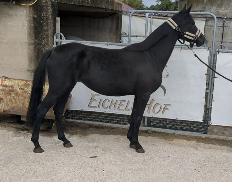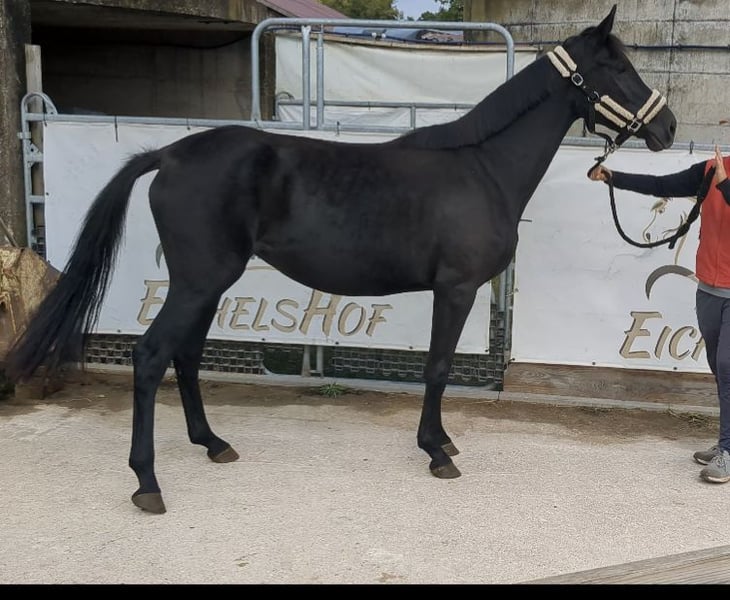Wir bieten eine schicke lackschwarze Stute aus eigener Zucht an. Sie ist ein feingliedriges Pferd mit korrektem Fundament. Im Umgang ist sie ein richtiger Schatz: halfterführig, lässt sich überall anfassen, gibt rundum Hufe, ist brav beim Schmied und war nie krank. Sie hat 3 sehr GGA und man kann somit eine große Karriere im Viereck im Viereck erwarten. Sie wird aktuell 24/7 auf der Koppel in der altersgemischten Stutenherde gehalten. Im Winter stand sie mit der Herde im Offenstall mit 24h freiem Koppelzugang. Näheres geren per WhatsApp oder telefonisch!