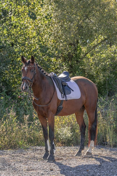 Wonder is a double-registered, exceptionally well-behaved, friendly, and fearless 4-year-old mare. She possesses very good basic gaits and shows a great jump when free jumping. She has been started under saddle in all three basic gaits and is now being gently further trained. She is already making her first jumps under saddle, where she demonstrates fearlessness, absolute clarity of mind, good behavior, and a willingness to learn. Now she is ready for a new owner and new tasks. She has grown up in a herd, is very compatible, and always wants to please. She has been regularly dewormed, vaccinated, and introduced to the farrier (due to a crack in the hoof at a short interval). If you are interested, we would be happy to send you videos and more information via WhatsApp.