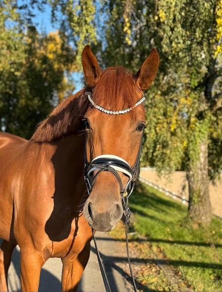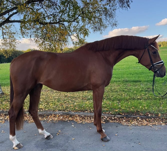 Diese wunderschöne Fuchsstute von Vaderland x San Domingo besticht nicht nur durch ihre edle Optik. Sie ist für ihre vier Jahres bereits sehr rittig, brav, unerschrocken und super bequem zu sitzen. Sie hat drei gute gga und lernt schnell. Sie eignet sich auch für einen Amateur oder Umsteiger. Die Stute ist Schmiede und verladefromm und im täglichen Umgang unkompliziert. Guter Tüv vorhanden. Kann jederzeit probegeritten werden. In 97285 Röttingen. Nur telefonisch melden unter 01797002982 oder 015117238135