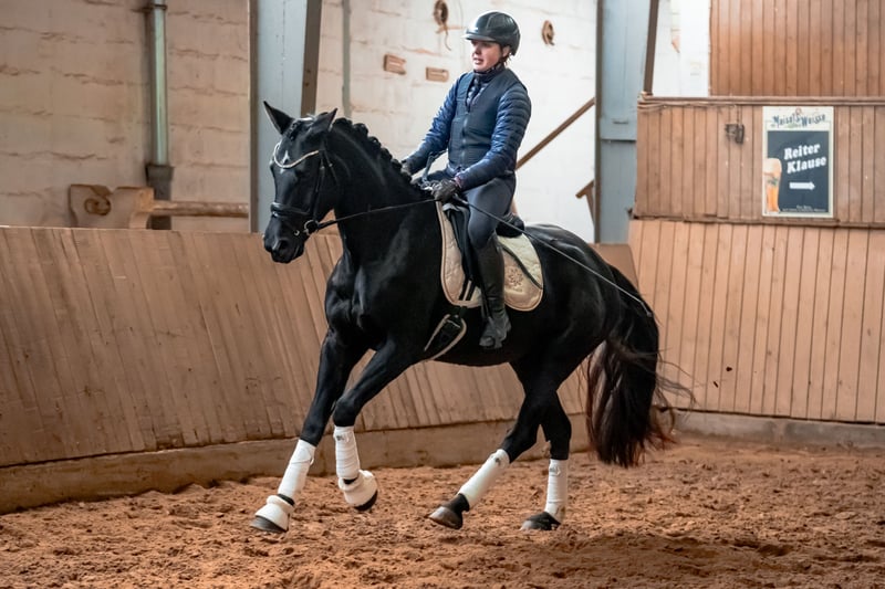 Se ofrece la prometedora y versátil yegua Chiara della Luna SCH, un caballo de deporte alemán con una base sólida, carácter agradable y las mejores condiciones para una exitosa carrera en el mundo ecuestre. Datos principales: • Nombre: Chiara della Luna SCH • Raza: Caballo de deporte alemán • Sexo: Yegua • Altura: aproximadamente 1,64 m (16.1 hh) • Nivel de entrenamiento: montada, nivel de caballos de competición • Carácter: obediente, bien educada, tranquila en la herrería y en el transporte, sociable con las personas Chiara della Luna SCH demuestra en su trato diario ser muy amigable y accesible. Le encanta que la cepillen y acaricien, disfruta de toda forma de atención y establece rápidamente un vínculo de confianza con su cuidador. Es completamente tranquila durante la herrería y en el proceso de carga en el camión. Es importante saber que Chiara no quiere que la monten en su box; prefiere procesos claros fuera de ella y allí también se muestra relajada. Condiciones de alojamiento: Chiara della Luna SCH se siente más cómoda en boxes con acceso diario a paddock o pradera. Le gusta tener su paddock o pradera en soledad, ya que aquí puede relajarse y descansar mejor. Bajo la silla, se presenta como una yegua delicada, con ganas de aprender y con una buena actitud hacia el trabajo. Debido a su juventud y nivel de entrenamiento, necesita un jinete sensible, justo y firme, que la apoye con paciencia y la ayude a progresar con cuidado. No es una yegua para principiantes, pero posee un gran potencial para jinetes ambiciosos que disfruten de la responsabilidad de seguir formando a un caballo joven. Destaca especialmente por su talento en el salto libre: muestra visión, técnica y capacidad. Gracias a este potencial, también la podemos imaginar en recorridos de salto o en concursos de tres días. Chiara della Luna obtuvo en la exhibición de yeguas de la PZG en Mammendorf en 2023, un excelente cuarto lugar entre las yeguas de dos años, con una nota de 8,2, lo que demuestra su calidad y potencial. Un caballo ideal para jinetes con sensibilidad, paciencia y un plan claro. Para más información o si está interesado, no dude en contactarnos por mensaje o llamada. Es posible realizar una prueba de monta previa cita.