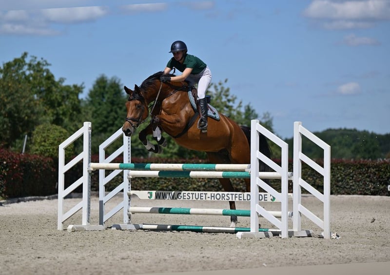 Diana H is the daughter of the renowned Holsteiner Verband stallion DEL ARKO, known for his rideability and willingness to perform. Her dam is by Chacco Blue, one of the world's most successful show jumping sires. She has been gently started under saddle and has had the opportunity to further develop during the important growth phase in the pasture. Recently, she has returned to work under saddle and is already demonstrating outstanding ability and great awareness in free jumping at the beginning of her sporting career. With excellent technique and awareness in free jumping, she impresses. A promising young horse that is ideally suited for further training by ambitious, experienced riders and trainers who focus on quality, lineage, and potential.