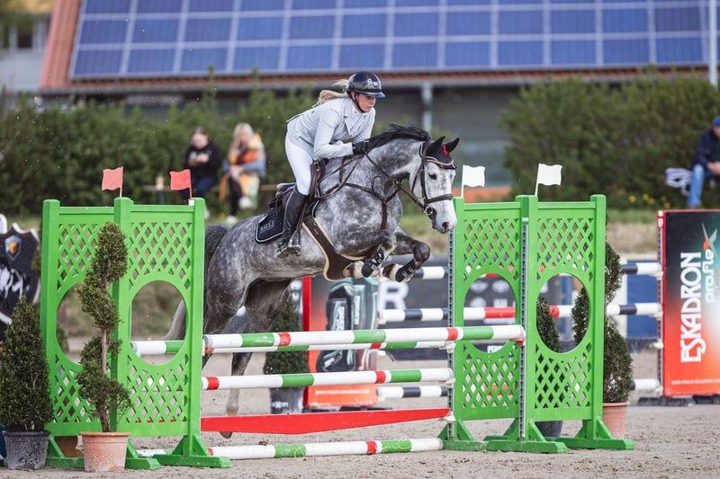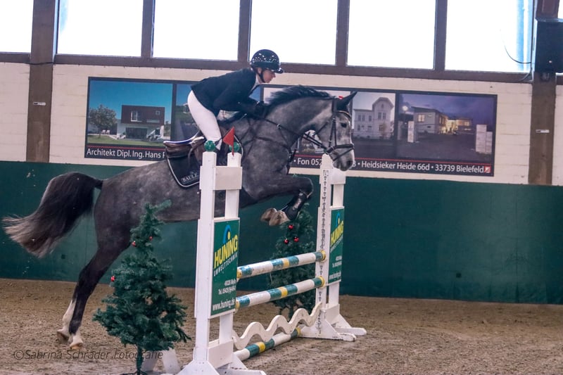 Beautiful sporty mare with top pedigree. She has already placed and won multiple times in show jumping competitions of class A with scores of 8. Due to her athletic attitude and her caution at the jump, she is ideally suited for pony transition. Well-behaved in the field.