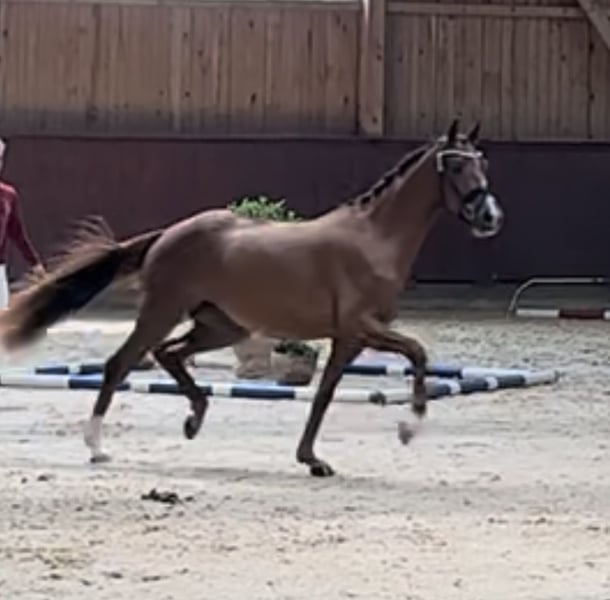 Directly from the breeder, this gently trained mare has already foaled. She completed her mare performance test at age three and was awarded the State Premium at the regional show. She possesses three very good basic gaits, a springy trot, a canter with good impulsion, and a walk that flows through her body. She is not spooky, does not buck or rear, and is very sweet and easy to handle. An ideal horse for high-level dressage as well as for the ambitious leisure rider. Due to lack of time, she has not yet been presented publicly at competitions. She is in the early stages of L-level dressage training but always participates positively.