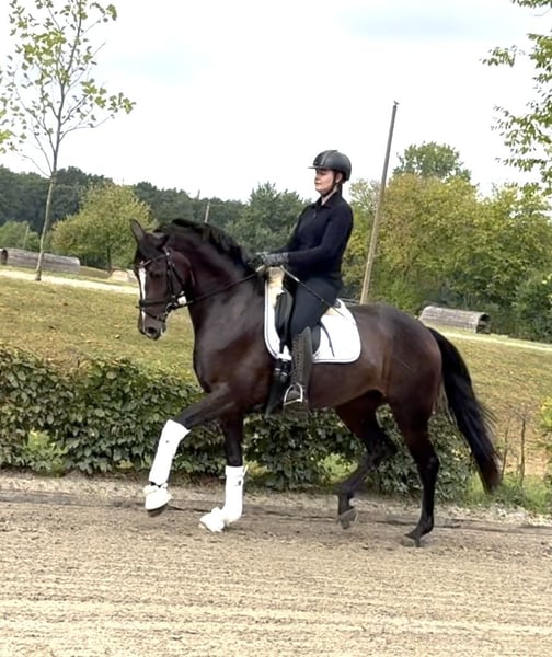 Jovina comes from our own breeding, has grown up with us, and has been carefully trained. At four years old, she was backed and is now, at five, already placed in A and L dressage competitions. She impresses with a very active, powerful hind leg, a lot of expression in her movement, and a high willingness to collect. Riding qualities: • easy to ride and comfortable to sit on • much go, always eager and willing to work • always uncomplicated and pleasant in the hand Character: friendly, motivated, and therefore ideal for ambitious riders looking for a talented young horse. Jovina combines willingness to perform, rideability, and beauty – a mare with great potential for advanced dressage sport. X-rays are available at four years old with no findings.