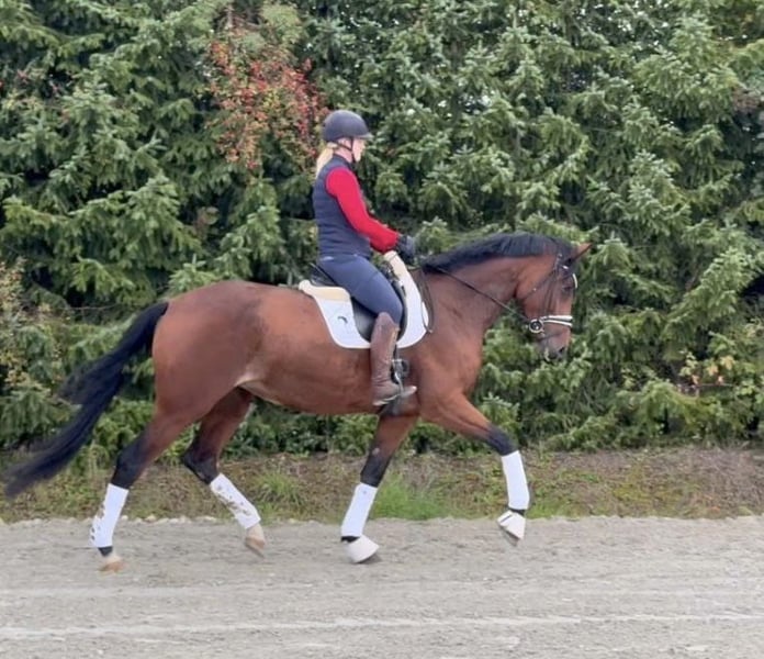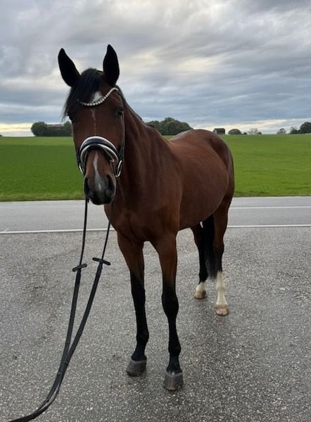 Cette jument Topas expressive recherche un nouveau foyer où elle pourra briller. « Lizzy » est en notre possession depuis décembre 2024 et a été doucement formée au niveau A durant l'été. Nous avons commencé à travailler avec elle en petites séances de saut L. Lizzy connaît le travail avec des barres au sol et des cavaletti, et elle avance courageusement en terrain. Pour des raisons de temps, elle n’a pas encore participé à des concours cette année, mais elle est déjà inscrite à la Fédération Équestre Nationale (FN) et pourrait débuter immédiatement. Lors des entraînements en extérieur, elle s’est toujours montrée très détendue et sans peur. Elle est enregistrée dans le livre d’élevage du Verband Baden-Württemberg du sport équestre. Elle possède un caractère très agréable et cherche toujours à plaire à son humain. Elle adore être brossée et câlinée. Chez nous, Lizzy passe la journée dans un petit troupeau de juments sur le paddock ou en pâture, et la nuit dans son propre box. Nous souhaitons lui offrir un foyer où elle sera encouragée et où elle recevra toute l’attention de son propriétaire. Lizzy est entièrement vaccinée, a toujours été vermifugée régulièrement (de manière sélective) et voyage très calmement en van. De bonnes radiographies sont disponibles. En raison de sa taille et de son âge, elle n’est pas encore adaptée aux enfants, et les débutants ou les reprises doivent être accompagnés d’un entraîneur ou d’un préparateur. Pour une rencontre avec une séance d’essai, une participation de 25 euros en espèces est exigée immédiatement.