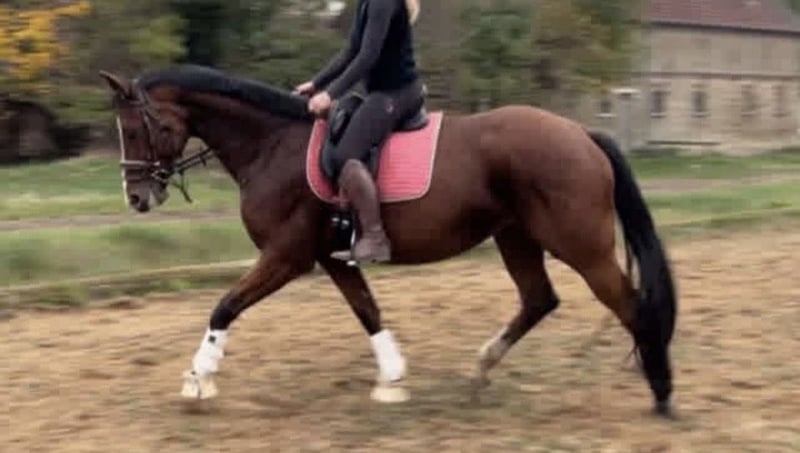 Schweren Herzens muss ich mich von meiner Stute trennen. Sie will immer gefallen, arbeitet toll mit, will viel Bewegung und hat sehr schöne Gänge und einen tollen Sprung. Sie Brauch dennoch einen Reiter der ihr Sicherheit gibt und sie lesen kann, denn wenn jemand unsicher auf ihr sitzt oder was nicht passt zeigt sie das auch mal Bocken. Sie testet gern aus, sobald sie aber merkt das der Mensch sich nicht beeindrucken lässt ist sie wieder komplett bei der Sache und arbeitet super mit. Leider bin ich ihrer Art nicht gewachsen, weshalb ich sie abgeben möchte. Auf dauer steht sie bei mir einfach zu viel, sie brauch regelmäßig Bewegung und Arbeit. Sie ist angeritten (Reitbar in allen GGA, Anlehnung, schenkelweichen…), kennt die Basics, ist im Gelände geritten, geht als Handpferd, ist beim Tierarzt und beim Schmied sehr vornehmlich und toll an der Hand gearbeitet. Es ist eine große AKU inklusive Röntgenbilder vorhanden, die Zähne sind frisch gemacht, sie war in regelmäßiger Ostheopathischer Behandlung, wurde regelmäßig dem Schmied vorgestellt und ist frisch entwurmt. Reitvideos sind vorhanden und werden bei Interesse verschickt!