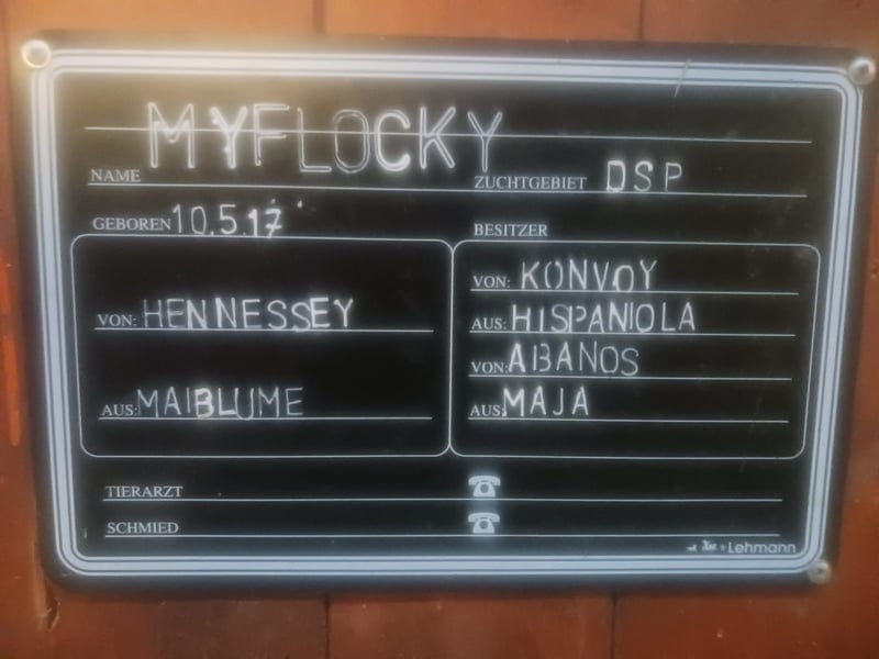 Flocky to kochana klacz, która u nas dorastała od okresu foals. Zawsze była dobrze usposobiona zarówno w kontaktach, jak i podczas jazdy. Ze względu na brak czasu i reitera nie była zbyt intensywnie trenowana. Niestety u niej stwierdzono wada serca (obecnie nie ogranicza jej to, ale powinna być regularnie kontrolowana). Z tego powodu Flocky sprzedawana jest znacznie poniżej wartości, aby trafiła na jeszcze jeden piękny dom. W przypadku zainteresowania lub pytań prosimy o kontakt pod numerem 09924/1260 lub 0170/7130833. Nie interesują nas handlarze!