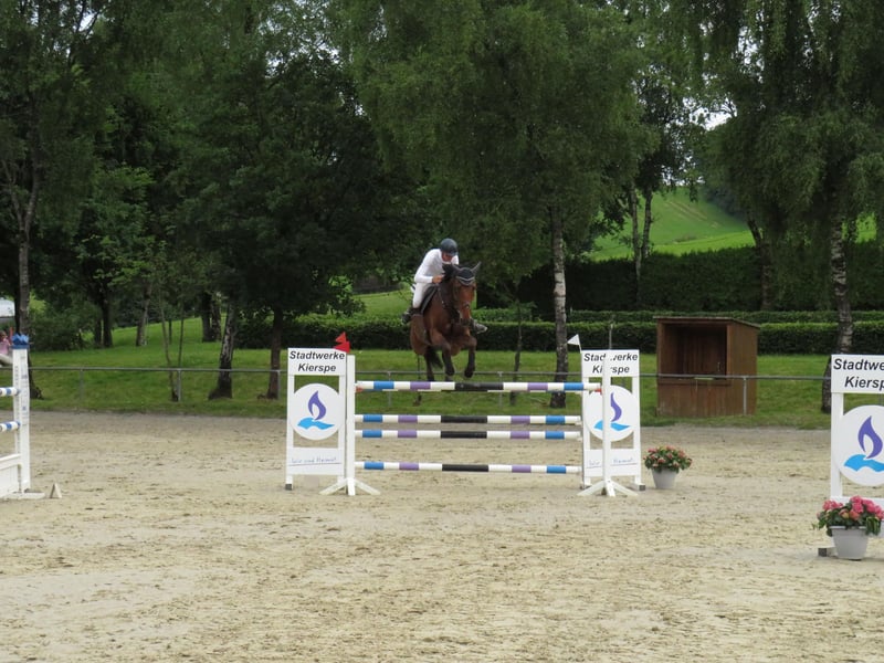 Giovane castrone Westfaliano di 14 anni, figlio di Capilano e Acord II. Presentato da un dilettante nelle categorie M e S. In questa stagione ha raggiunto le classifiche fino a M**. Facile e gentile nel rapporto quotidiano. Per ulteriori informazioni o domande, non esitate a contattarmi. +49 176 71241561