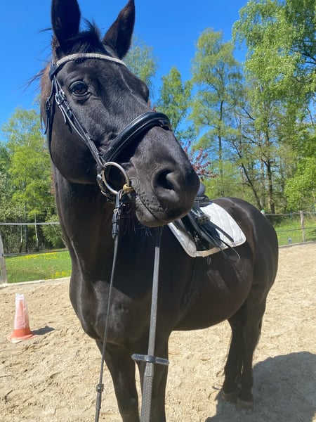 Menny ist ein 16-jähriger außergewöhnlich schöner und harmonischer Rappwallach (V: Trakehner Ovaro) der auf unserem Ponyhof seine Aufgabe nicht findet. Er braucht mehr Aufmerksamkeit und möchte viel öfter ins Gelände gehen oder auf dem Platz beschäftigt werden (Dressur, Stangenarbeit, Bodenarbeit, Longieren,…) Menny ist aufgrund seiner schwungvollen Bewegungen und seines großrahmigen Galopps kein Anfängerpferd. Bis auf eine witterungsbedingte Erkältung durch das Leben in der robusten Ponyherde war er hier seit 8 Jahren immer fit. Aktuell wird er im Winterhalbjahr im Offenstall und auf der Weide eingedeckt. Er läuft barhuf, kennt aber auch Eisen oder Hufschuhe. Er hat drei gute Grundgangarten und geht problemlos allein ins Gelände. Menny sucht seinen Herzensmenschen, der ihm mehr Zeit widmen kann. Für uns ist eine artgerechte Haltung und ein fairer Umgang mit dem Pferd letztendlich wichtiger als der Preis. Zubehör kann mit übernommen werden. Um Reittourismus zu vermeiden, nehmen wir für das Probereiten 40€.