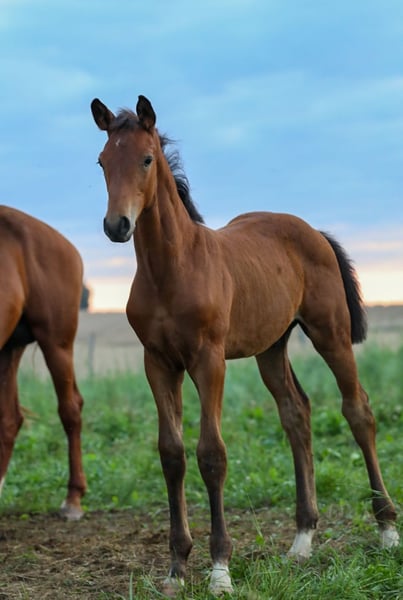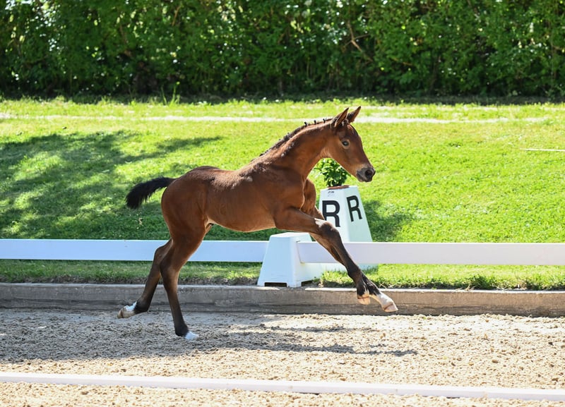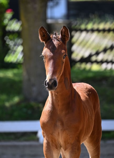 Here we offer a very special rough diamond from our own breeding and raising: BORDEAUX x FLORENCIO I x RASCALINO x DE NIRO x ARGENTINUS 3 siblings of his mother are internationally successful at PSG/Inter I level. 1 brother of the yearling has multiple S* placements and has won PSG. 1 sister of the yearling has completed the mare performance test with an external score of 9.50. The colt is tall, with a realistic final height of 170 - 172 cm. He stands on very correct foundations, which speaks for durability. He is clear-headed and exceptionally friendly towards humans. Currently, he shows no stallion behavior. He lives in a mixed-age herd with breeding mares and other yearlings in a 24/7 open and active stable with pasture. Due to the sporting successes in the direct maternal line, a very promising future can also be expected for this yearling. If needed, he can remain here in his familiar herd for further raising, but with castration at the end of 2025.