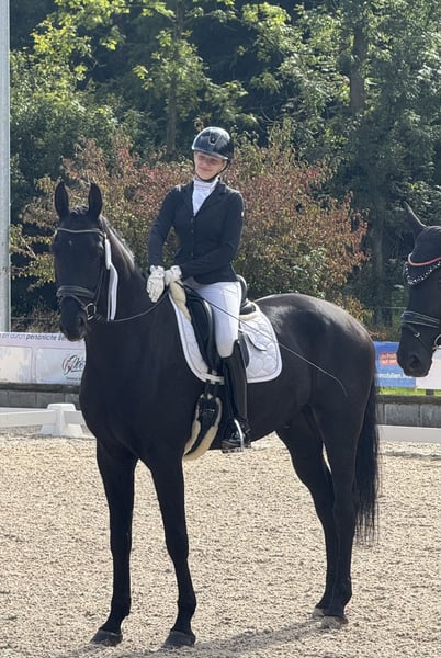 Zum Verkauf steht dieser talentierte 5 jährige Rapp Wallach von Grand Galaxy Win x D’Amour mit einem Stockmaß von 1,80 m. Er zeigt großes Talent in der Dressur und ist bereit sich weiterzuentwickeln. Auf Grund seiner Größe wurde er schonend angeritten und ausgebildet. Er zeigt sich stets motiviert und lernt neue Lektionen in Rekordzeit. Aktuell befindet er sich auf einem soliden Dressurpferde L Niveau. Bisher wurde er ausschließlich in der Dressur gefördert. In der vergangen Saison wurde auf dem Turnier mehrfach erfolgreich in der Klasse A vorgestellt. Neben seinem Dressurtalent zeigt er sich auch beim Freispringen äußerst begabt und motiviert. Das Springen mit Reiter wurde jedoch bisher nicht gefördert. Zudem liebt er das Ausreiten und ist im Gelände wirklich ein absolutes Verlasspferd. Besonders hervorzuheben ist außerdem sein toller Charakter: Stets bemüht, einfühlsam und super lieb, egal ob im Umgang mit Menschen oder anderen Pferden. Bisher zeigte er unter dem Reiter noch keinerlei Unarten wie Bocken, usw. und hat tatsächlich noch nie seinen Reiter in den Sand gesetzt. Dennoch ist zu Betonen, dass es sich um ein junges Pferd handelt, welches noch viel Unterstützung von seinem Reiter benötigt. Bei Interesse, für Videos und weitere Informationen stehe ich gerne zur Verfügung. Besichtigungen und Probereiten sind nach Absprache jederzeit möglich. Wir sind jederzeit erreichbar unter 01749391946. Wir freuen uns auf Ihre Nachricht!