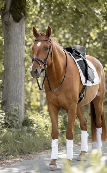For sale is a promising German sport horse gelding, born in 2019. The elegant chestnut impresses with his impressive height of 16.1 hh and his affectionate temperament. He is ideally suited for dressage and already shows promising potential in his training. With his friendly nature and reliable demeanor, he is an excellent partner for ambitious and experienced riders who value a good and steady dressage horse. This talented athlete combines a strong willingness to perform with a pleasant character and is eager for a new sporting challenge. Despite his gentle nature, he is not suitable for beginners or children.