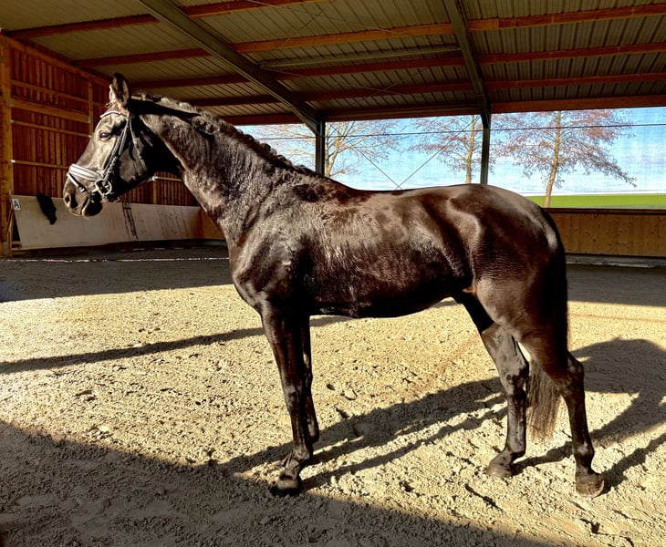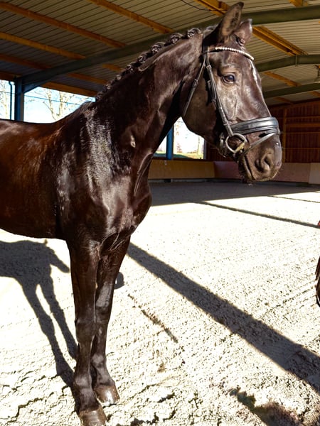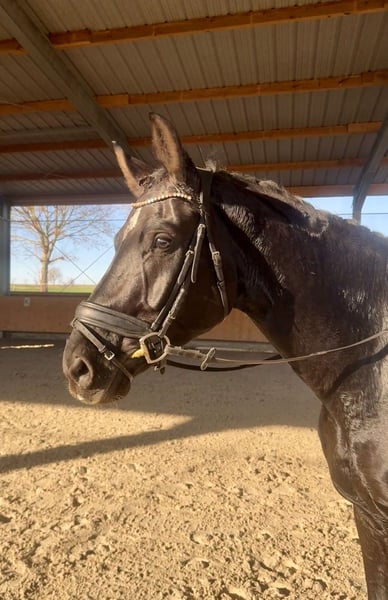 Ich biete hier meinen Rappwallach, geboren 2019 und ca. 175 cm groß, aus liebevollen Privat Händen zum Verkauf an. Er ist ein typvoller, langbeiniger Blickfang, der sowohl im Training als auch auf dem Turnier immer wieder mit seiner Präsenz überzeugt. Er ist grundsätzlich motiviert und arbeitet gerne mit, benötigt jedoch einen erfahrenen und klaren Reiter, da er – typisch Jungpferd – gerne testet. Mit einer souveränen, ruhigen Führung ist er ein sehr mutiger und unerschrockener Partner, der sich schnell orientiert und Vertrauen schenkt. Dressurbetont gezogen, bringt er gute Grundgangarten und eine moderne Silhouette mit. Besonders der Schritt und die große Gallopade sind hervorzuheben. Er wurde 3-jährig zur Körung vorgestellt und danach gelegt. Auf Turnieren zeigt er manchmal noch etwas hengstiges Auftreten, konnte aber durch seine Ausstrahlung und Reitqualität 2023 und 2024 mehrfach hohe Platzierungen erreichen. Aktuell werden im Training die ersten L-Lektionen eingebaut. Zusätzlich wurden zur Abwechslung im Training bereits kleine Parcours gesprungen, dabei zeigt er sich motiviert und geschickt. Im Schritt ohne Reiter zeigt er gelegentlich eine Auffälligkeit im Gangbild. Es liegen Röntgenbilder aus 09/2021 vor, die bei ernsthaftem Interesse gerne eingesehen werden können. Ein junger, talentierter Wallach mit vielen Möglichkeiten, der einen engagierten, klaren Reiter sucht, der Freude an Charakterpferden hat. Bei Interesse sende ich gerne weitere Videos oder vereinbare einen Termin zum Probereiten.