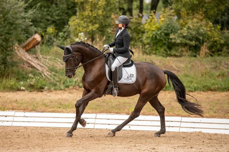 I am offering my 2019-born, approximately 17.5 hh dark bay gelding from loving private hands for sale. He is a well-built, long-legged eye-catcher who consistently impresses with his presence both in training and at competitions. He is generally motivated and enjoys working, but requires an experienced and confident rider, as he tends to test boundaries—typical for a young horse. With a calm and assertive handler, he is a very brave and fearless partner who quickly finds his bearings and builds trust. Bred primarily for dressage, he possesses good basic gaits and a modern silhouette. His walk and extended canter are particularly noteworthy. He was presented at the licensing as a three-year-old and was subsequently gelded. At shows, he sometimes still exhibits a somewhat stallion-like demeanor, but his charisma and riding quality have earned him multiple high placings in 2023 and 2024. Currently, the first L-level lessons are being incorporated into his training. In free movement without a rider, he occasionally shows some irregularity in his gait. X-rays from September 2021 are available and can be reviewed upon serious interest. A young, talented gelding with great potential, seeking an engaged, confident rider who enjoys characterful horses. If interested, I am happy to provide additional videos or arrange a trial ride.