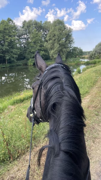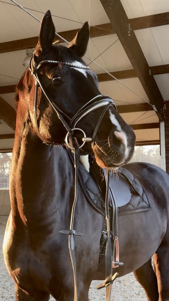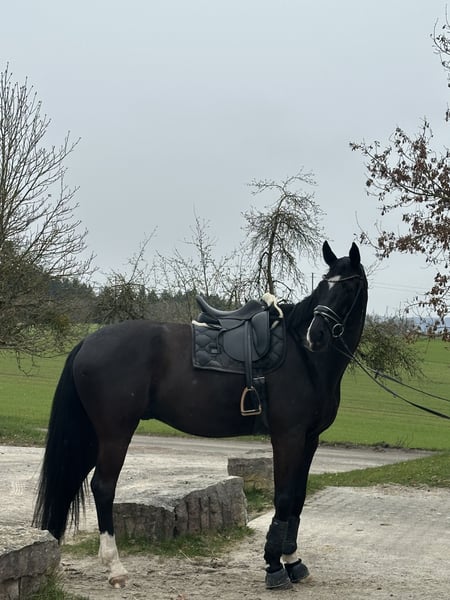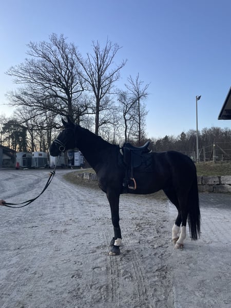 A large-framed, sensitive gelding – suitable for experienced and confident riders. It is with a heavy heart that I am selling my 7-year-old gelding Danci (born 2019), approximately 1.80 m in height, whom I have owned since he was a foal. Danci is a sensitive and alert gelding currently working at solid A-level. He is familiar with both riding under saddle and ground work. He enjoys hacking out in company or in a group and remains well-behaved during these outings. Danci is not suitable for beginners and requires an experienced, confident rider who is calm, patient, and consistent in working with him to provide the necessary security. In handling, he is uncomplicated: he is farrier-friendly, well-behaved at the vet, easy to load (even alone), and experienced with the treadmill. Currently, Danci is kept in a paddock box where he feels very comfortable. Keeping him in a small, quiet herd is also possible, as he is a very social horse. A grain intolerance should be taken into account in his diet. X-rays of his back are available. He has received regular care, including annual dental treatments (most recently last summer), as well as physiotherapy and chiropractic treatments. I am looking for an experienced and empathetic home where he can be gently further developed with patience. If genuinely interested, I would be happy to receive a message with more detailed information.